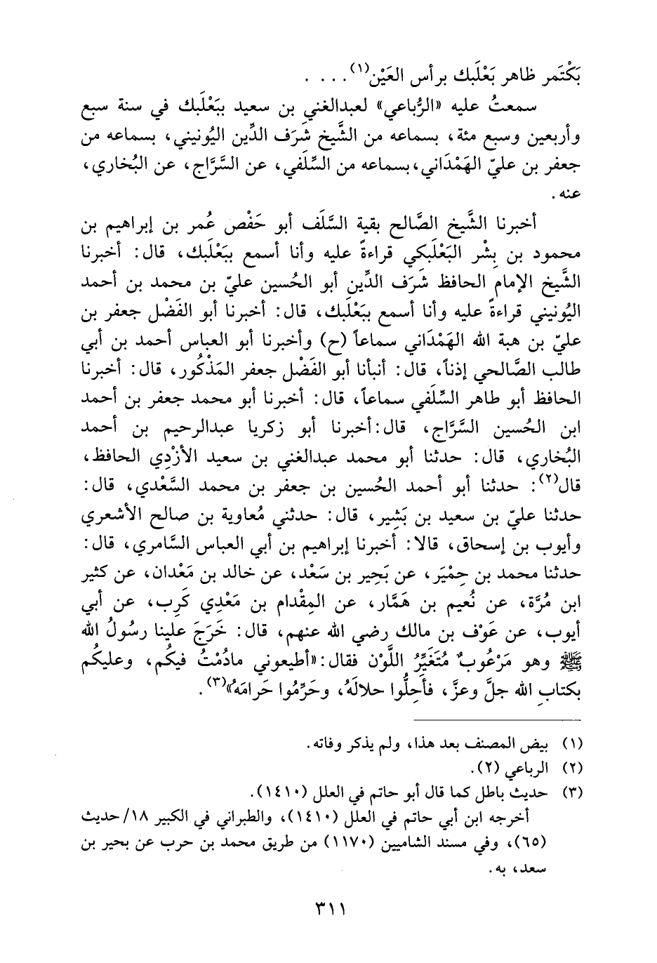 أَخْبَرَنَا الشَّيْخُ الصَّالِحُ بَقِيَّةُ السَّلَفِ أَبُو حَفْصٍ عُمَرُ بْنُ إِبْرَاهِيمَ بْنِ مَحْمُودِ بْنِ بِشْرٍ الْبَعْلَبَكِّيُّ قِرَاءَةً عَلَيْهِ وَأَنَا أَسْمَعُ بِبَعْلَبَكَّ، قَالَ: أَخْبَرَنَا الشَّيْخُ الإِمَامُ الْحَافِظُ شَرَفُ الدِّينِ أَبُو الْحُسَيْنِ عَلِيُّ بْنُ مُحَمَّدِ بْنِ أَحْمَدَ الْيُونِينِيُّ قِرَاءَةً عَلَيْهِ وَأَنَا أَسْمَعُ بِبَعْلَبَكَّ، قَالَ: أَخْبَرَنَا أَبُو الْفَضْلِ جَعْفَرِ بْنِ عَلِيِّ بْنِ هِبَةِ اللَّهِ الْهَمْدَانِيُّ سَمَاعًا (ح) وَأَخْبَرَنَا أَبُو الْعَبَّاسِ أَحْمَدُ بْنُ أَبِي طَالِبٍ الصَّالِحِيُّ إِذْنًا، قَالَ: أَنْبَأَنَا أَبُو الْفَضْلِ جَعْفَرٌ الْمَذْكُورُ، قَالَ: أَخْبَرَنَا الْحَافِظُ أَبُو طَاهِرٍ السِّلَفِيُّ سَمَاعًا، قَالَ: أَخْبَرَنَا أَبُو مُحَمَّدٍ جَعْفَرُ بْنُ أَحْمَدَ بْنِ الْحُسَيْنِ السَّرَّاجُ، قَالَ: أَخْبَرَنَا أَبُو زَكَرِيَّا عَبْدُ الرَّحِيمِ بْنُ أَحْمَدَ الْبُخَارِيُّ، قَالَ: حَدَّثَنَا أَبُو مُحَمَّدٍ عَبْدُ الْغَنِيِّ بْنُ سَعِيدٍ الأَزْدِيُّ الْحَافِظُ، قَالَ: حَدَّثَنَا أَبُو أَحْمَدَ الْحُسَيْنُ بْنُ جَعْفَرِ بْنِ مُحَمَّدٍ السَّعْدِيُّ، قَالَ: حَدَّثَنَا عَلِيُّ بْنُ سَعِيدِ بْنِ بَشِيرٍ، قَالَ: حَدَّثَنِي مُعَاوِيَةُ بْنُ صَالِحٍ الأَشْعَرِيُّ وَأَيُّوبُ بْنُ إِسْحَاقَ، قَالا: أَخْبَرَنَا إِبْرَاهِيمُ بْنُ أَبِي الْعَبَّاسِ السَّامِرِيُّ، قَالَ: حَدَّثَنَا مُحَمَّدُ بْنُ حِمْيَرَ، عَنْ بَحِيرِ بْنِ سَعْدٍ، عَنْ خَالِدِ بن معدان، عن كثير ابن مُرَّةَ، عَنْ نُعَيْمِ بْنِ هَمَّارٍ، عَنِ الْمِقْدَامِ بْنِ مَعْدِي كَرِبٍ، عَنْ أَبِي أَيُّوبَ، عَنْ عَوْفِ بْنِ مَالِكٍ رَضِيَ اللَّهُ عَنْهُمْ، قَالَ: خَرَجَ عَلَيْنَا رَسُولُ اللَّهِ صَلَّى اللَّهُ عَلَيْهِ وَسَلَّمَ وَهُوَ مرعوبٌ مُتَغَيِّرُ اللَّوْنِ فَقَالَ: ((أَطِيعُونِي مَا دُمْتُ فِيكُمْ، وَعَلَيْكُمْ بِكِتَابِ اللَّهِ جَلَّ وَعَزَّ، فَأَحِلُّوا حَلالَهُ، وَحَرِّمُوا حَرَامَهُ)) .