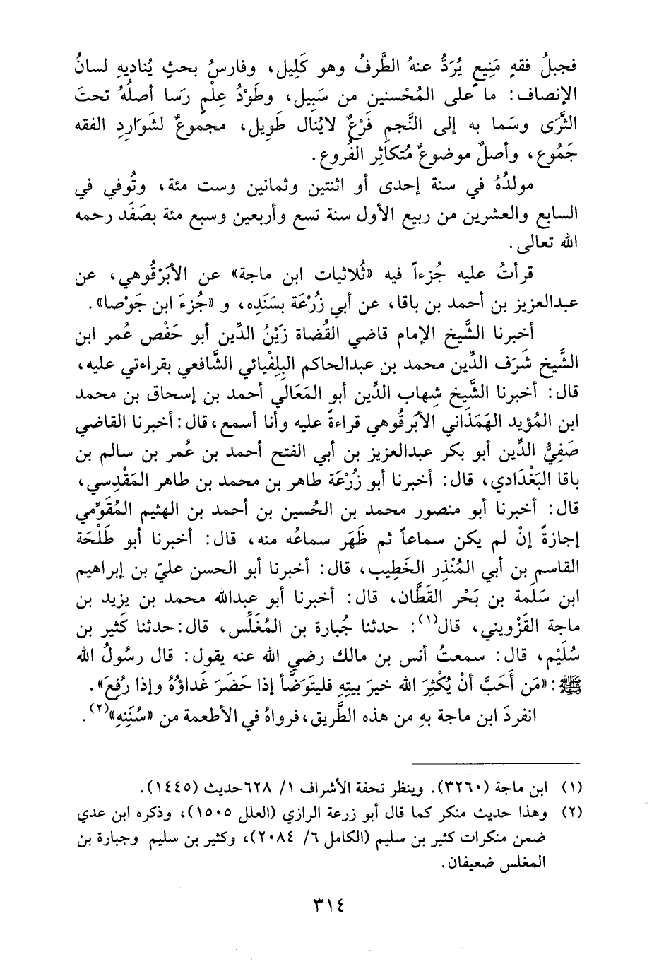 أَخْبَرَنَا الشَّيْخُ الإِمَامُ قَاضِي الْقُضَاةِ زَيْنُ الدِّينِ أَبُو حَفْصٍ عُمَرُ ابْنُ الشَّيْخِ شَرَفِ الدِّينِ مُحَمَّدِ بْنِ عَبْدِ الْحَاكِمِ الْبَلْفِيَائِيُّ الشَّافِعِيُّ بِقِرَاءَتِي عَلَيْهِ، قَالَ: أَخْبَرَنَا الشَّيْخُ شِهَابُ الدِّينِ أَبُو الْمَعَالِي أَحْمَدُ بْنُ إِسْحَاقَ بْنِ مُحَمَّدِ ابْنِ الْمُؤَيَّدِ الْهَمَذَانِيُّ الأَبَرْقُوهِيُّ قِرَاءَةً عَلَيْهِ وَأَنَا أَسْمَعُ، قَالَ: أَخْبَرَنَا الْقَاضِي صَفِيُّ الدِّينِ أَبُو بَكْرٍ عَبْدُ الْعَزِيزِ بْنُ أَبِي الْفَتْحِ أَحْمَدَ بْنِ عُمَرَ بْنِ سَالِمِ بْنِ بَاقَا الْبَغْدَادِيُّ، قَالَ: أَخْبَرَنَا أَبُو زُرْعَةَ طَاهِرُ بْنُ مُحَمَّدِ بْنِ طَاهِرٍ الْمَقْدِسِيُّ، قَالَ: أَخْبَرَنَا أَبُو مَنْصُورٍ مُحَمَّدُ بْنُ الْحُسَيْنِ بْنِ أَحْمَدَ بْنِ الْهَيْثَمِ الْمُقَوِّمِيُّ إِجَازَةً إِنْ لَمْ يَكُنْ سَمَاعًا ثُمَّ ظَهَرَ سَمَاعُهُ مِنْهُ، قَالَ: أَخْبَرَنَا أَبُو طَلْحَةَ الْقَاسِمُ بْنُ أَبِي الْمُنْذِرِ الْخَطِيبُ، قَالَ: أَخْبَرَنَا أَبُو الْحَسَنِ عَلِيُّ بْنُ إِبْرَاهِيمَ بْنِ سَلَمَةَ بْنِ بَحْرٍ الْقَطَّانُ، قَالَ: أَخْبَرَنَا أَبُو عَبْدِ اللَّهِ مُحَمَّدُ بْنُ يَزِيدَ بْنِ مَاجَهْ الْقَزْوِينِيُّ، قَالَ: حَدَّثَنَا جُبَارَةُ بْنُ الْمُغَلِّسِ، قَالَ: حَدَّثَنَا كَثِيرُ بْنُ سُلَيْمٍ، قَالَ: سَمِعْتُ أَنَسَ بْنَ مَالِكٍ رَضِيَ اللَّهُ عَنْهُ يَقُولُ: قَالَ رَسُولُ اللَّهِ صَلَّى اللَّهُ عَلَيْهِ وَسَلَّمَ: ((مَنْ أَحَبَّ أَنْ يُكَثِّرَ اللَّهُ خَيْرَ بَيْتِهِ فَلْيَتَوَضَّأْ إِذَا حَضَرَ غَدَاؤُهُ وَإِذَا رُفِعَ)) .
