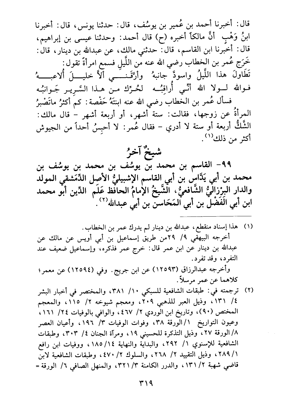 قَالَ: أَخْبَرَنَا أَحْمَدُ بْنُ عُمَيْرِ بْنِ يُوسُفَ، قَالَ: حَدَّثَنَا يُونُسُ، قَالَ: أَخْبَرَنَا ابْنُ وَهْبٍ، أَنَّ مَالِكًا أَخْبَرَهُ (ح) قَالَ أَحْمَدُ: وحَدَّثَنَا عِيسَى بْنُ إِبْرَاهِيمَ، قَالَ: أَخْبَرَنَا ابْنُ الْقَاسِمِ، قَالَ: حَدَّثَنِي مَالِكٌ، عَنْ عَبْدِ اللَّهِ بْنِ دِينَارٍ، قَالَ: خَرَجَ عُمَرُ بْنُ الْخَطَّابِ رَضِيَ اللَّهُ عَنْهُ مِنَ اللَّيْلِ فَسَمِعَ امْرَأَةً تَقُولُ: