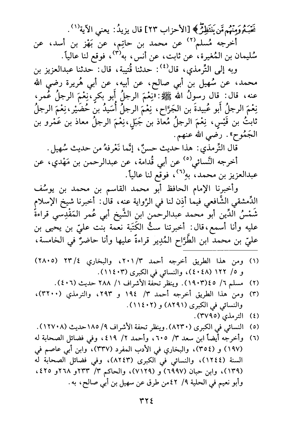 وَبِهِ إِلَى التِّرْمِذِيِّ، قَالَ: حَدَّثَنَا قُتَيْبَةُ، قَالَ: حَدَّثَنَا عَبْدُ الْعَزِيزِ بْنُ مُحَمَّدٍ، عَنْ سُهَيْلِ بْنِ أَبِي صَالِحٍ، عَنْ أَبِيهِ، عَنْ أَبِي هُرَيْرَةَ رَضِيَ اللَّهُ عَنْهُ، قَالَ: قَالَ رَسُولُ اللَّهِ صَلَّى اللَّهُ عَلَيْهِ وَسَلَّمَ: ((نِعْمَ الرَّجُلُ أَبُو بَكْرٍ، نِعْمَ الرَّجُلُ عُمَرُ، نِعْمَ الرَّجُلُ أَبُو عُبَيْدَةَ بْنُ الْجَرَّاحِ، نِعْمَ الرَّجُلُ أُسَيْدُ بْنُ حَضِيرٍ، نِعْمَ الرَّجُلُ ثَابِتُ بْنُ قَيْسٍ، نِعْمَ الرَّجُلُ مُعَاذُ بْنُ جبلٍ، نِعْمَ الرَّجُلُ مُعَاذُ بْنُ عَمْرِو بْنِ الْجَمُوحِ)) رَضِيَ اللَّهُ عَنْهُمْ.