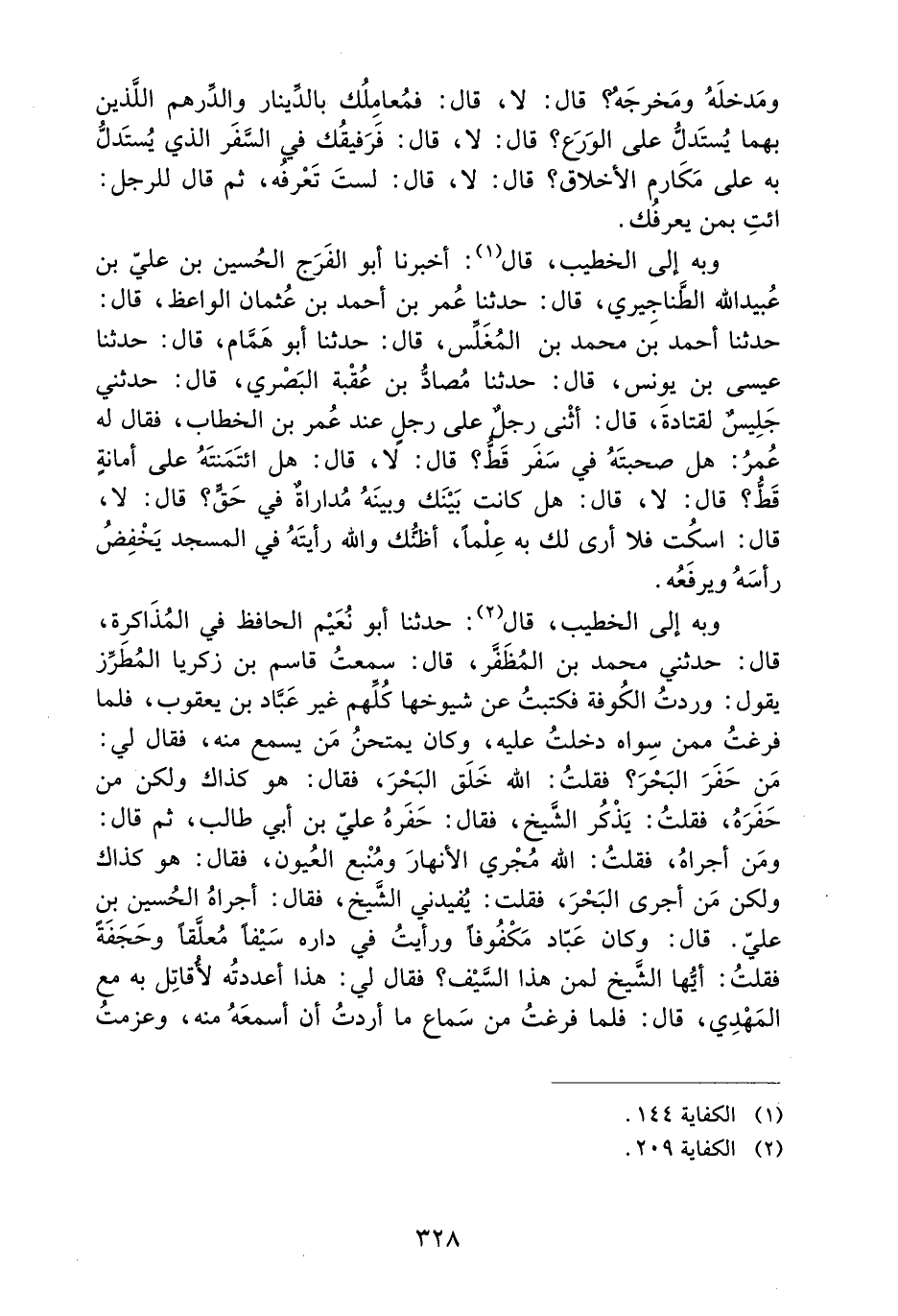 وَبِهِ إِلَى الْخَطِيبِ، قَالَ: أَخْبَرَنَا أَبُو الْفَرَجِ الْحُسَيْنُ بْنُ عَلِيِّ بْنِ عُبَيْدِ اللَّهِ الطَّنَاجِيرِيُّ، قَالَ: حَدَّثَنَا عُمَرُ بْنُ أَحْمَدَ بْنِ عُثْمَانَ الْوَاعِظُ، قَالَ: حَدَّثَنَا أَحْمَدُ بْنُ مُحَمَّدِ بْنِ الْمُغَلِّسِ، قَالَ: حَدَّثَنَا أَبُو هَمَّامٍ، قَالَ: حَدَّثَنَا عِيسَى بْنُ يُونُسَ، قَالَ: حَدَّثَنَا مَصَادُ بْنُ عُقْبَةَ الْبَصْرِيُّ، قَالَ: حَدَّثَنِي جليسٌ لِقَتَادَةَ، قَالَ: أَثْنَى رجلٌ عَلَى رَجُلٍ عِنْدَ عُمَرَ بْنِ الْخَطَّابِ، فَقَالَ لَهُ عُمَرُ: هَلْ صَحِبْتَهُ فِي سَفَرٍ قَطُّ؟ قَالَ: لا، قَالَ: هَلِ ائْتَمَنْتَهُ عَلَى أمانةٍ قَطُّ؟ قَالَ: لا، قَالَ: هَلْ كَانَتْ بَيْنَكَ وَبَيْنَهُ مداراةٌ فِي حَقٍّ؟ قَالَ: لا، قَالَ: اسْكُتْ فَلا أَرَى لَكَ بِهِ عِلْمًا، أَظُنُّكَ وَاللَّهِ رَأَيْتَهُ فِي الْمَسْجِدِ يَخْفِضُ رَأْسَهُ وَيَرْفَعُهُ.