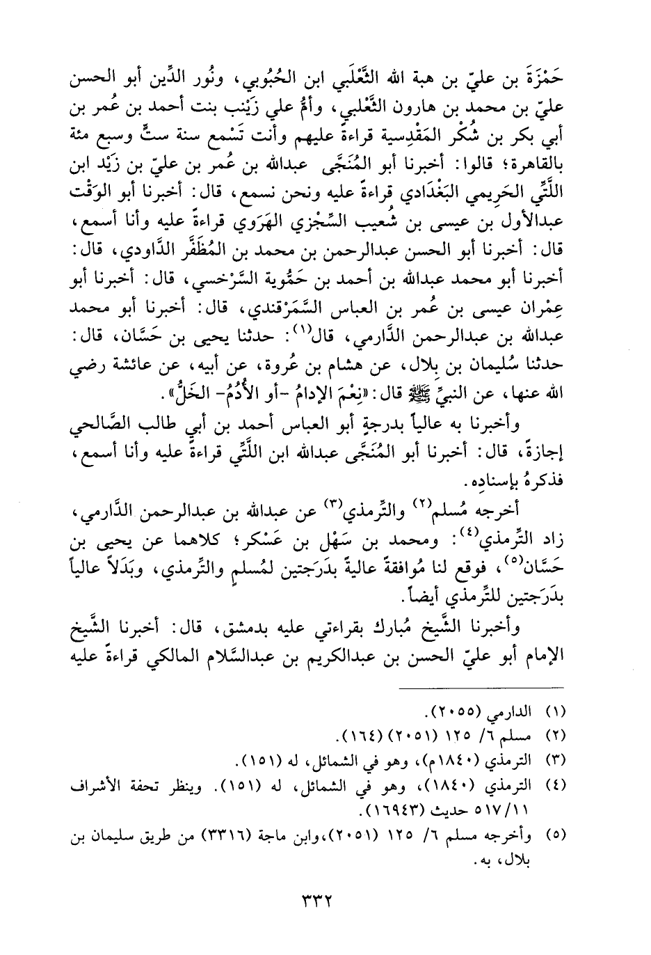 حَمْزَةَ بْنِ عَلِيِّ بْنِ هِبَةِ اللَّهِ الثَّعْلَبِيُّ ابْنُ الْحُبُوبِيِّ، وَنُورُ الدِّينِ أَبُو الْحَسَنِ عَلِيُّ بْنُ مُحَمَّدِ بْنِ هَارُونَ الثَّعْلَبِيُّ، وَأُمُّ عَلِيٍّ زَيْنَبُ بِنْتُ أَحْمَدَ بْنِ عُمَرَ بْنِ أَبِي بَكْرِ بْنِ شُكْرٍ الْمَقْدِسِيَّةُ قِرَاءَةً عَلَيْهِمْ وأنت تسمع سنة ست وسبع مئة بِالْقَاهِرَةِ؛ قَالُوا: أَخْبَرَنَا أَبُو الْمُنَجَّى عَبْدُ اللَّهِ بْنُ عُمَرَ بْنِ عَلِيِّ بْنِ زَيْدٍ ابْنِ اللُّتِّيِّ الْحُرَيْمِيُّ الْبَغْدَادِيُّ قِرَاءَةً عَلَيْهِ وَنَحْنُ نَسْمَعُ، قَالَ: أَخْبَرَنَا أَبُو الْوَقْتِ عَبْدُ الأَوَّلِ بْنُ عِيسَى بْنِ شُعَيْبٍ السِّجْزِيُّ الْهَرَوِيُّ قِرَاءَةً عَلَيْهِ وَأَنَا أَسْمَعُ، قَالَ: أَخْبَرَنَا أَبُو الْحَسَنِ عَبْدُ الرَّحْمَنِ بْنُ مُحَمَّدِ بْنِ الْمُظَفَّرِ الدَّاوُدِيُّ، قَالَ: أَخْبَرَنَا أَبُو مُحَمَّدٍ عَبْدُ اللَّهِ بْنُ أَحْمَدَ بْنِ حَمُّوَيْهِ السَّرْخَسِيُّ، قَالَ: أَخْبَرَنَا أَبُو عِمْرَانَ عِيسَى بْنُ عُمَرَ بْنِ الْعَبَّاسِ السَّمَرْقَنْدِيُّ، قَالَ: أَخْبَرَنَا أَبُو مُحَمَّدٍ عَبْدُ اللَّهِ بْنُ عَبْدِ الرَّحْمَنِ الدَّارِمِيُّ، قَالَ: حَدَّثَنَا يَحْيَى بْنُ حَسَّانٍ، قال: حدثا سُلَيْمَانُ بْنُ بِلالٍ، عَنْ هِشَامِ بْنِ عُرْوَةَ، عَنْ أَبِيهِ، عَنْ عَائِشَةَ رَضِيَ اللَّهُ عَنْهَا، عَنِ النَّبِيِّ صَلَّى اللَّهُ عَلَيْهِ وَسَلَّمَ قَالَ: ((نِعْمَ الإِدَامُ –أَوِ الأُدْمُ- الْخَلُّ)) .