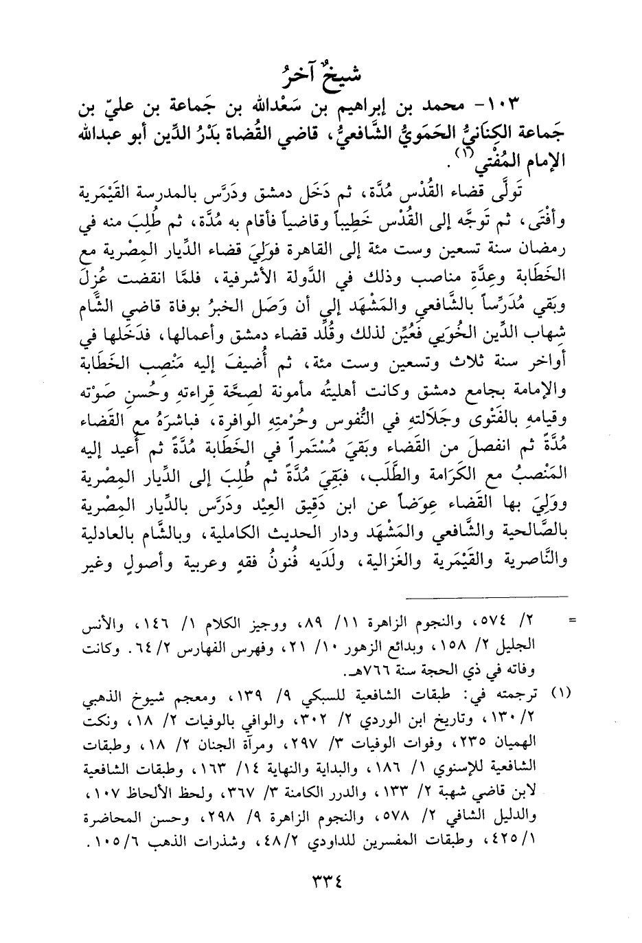 103- مُحَمَّدُ بْنُ إِبْرَاهِيمَ بْنِ سَعْدِ اللَّهِ بْنِ جَمَاعَةَ بْنِ عَلِيِّ بْنِ جَمَاعَةَ الْكِنَانِيُّ الْحَمَوِيُّ الشَّافِعِيُّ، قَاضِي الْقُضَاةِ بَدْرُ الدِّينِ أَبُو عَبْدِ اللَّهِ الإِمَامُ الْمُفْتِي.