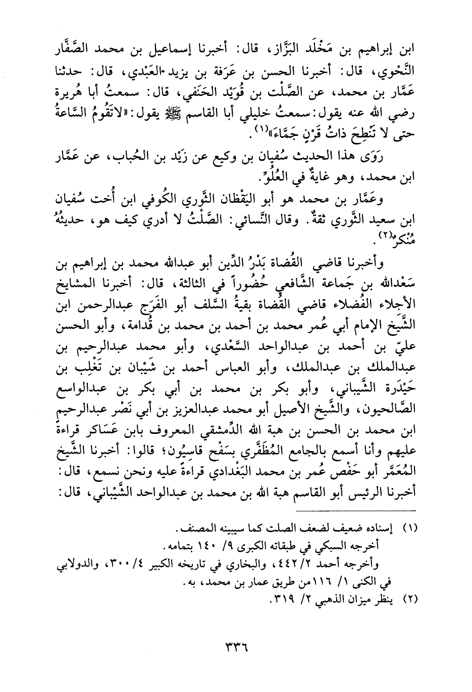 بْنِ إِبْرَاهِيمَ بْنِ مَخْلَدٍ الْبَزَّازُ، قَالَ: أَخْبَرَنَا إِسْمَاعِيلُ بْنُ مُحَمَّدٍ الصَّفَّارُ النَّحْوِيُّ، قَالَ: أَخْبَرَنَا الْحَسَنُ بْنُ عَرَفَةَ بْنِ يَزِيدَ الْعَبْدِيُّ، قَالَ: حَدَّثَنَا عَمَّارُ بْنُ مُحَمَّدٍ، عَنِ الصَّلْتِ بْنِ قُوَيْدٍ الْحَنَفِيِّ، قَالَ: سَمِعْتُ أَبَا هُرَيْرَةَ رَضِيَ اللَّهُ عَنْهُ يَقُولُ: سَمِعْتُ خَلِيلِيَ أَبَا الْقَاسِمِ صَلَّى اللَّهُ عَلَيْهِ وَسَلَّمَ يَقُولُ: ((لا تَقُومُ السَّاعَةُ حَتَّى لا تَنْطَحَ ذَاتُ قرنٍ جَمَّاءَ)) .