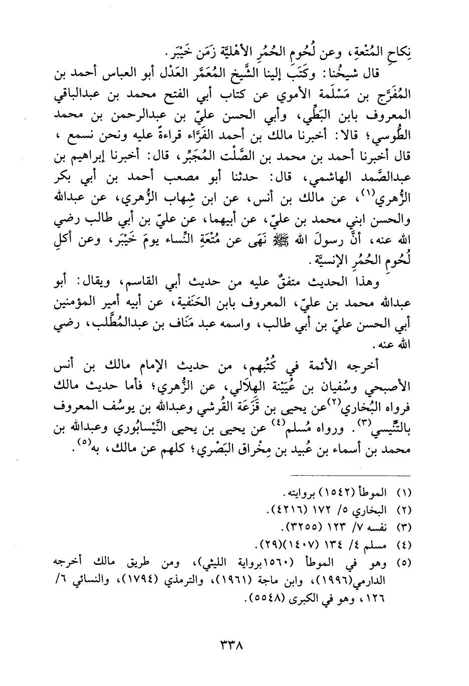 قَالَ شَيْخُنَا: وَكَتَبَ إِلَيْنَا الشَّيْخُ الْمُعَمَّرُ الْعَدْلُ أَبُو الْعَبَّاسِ أَحْمَدُ بْنُ الْمُفَرِّجِ بْنِ مَسْلَمَةَ الأُمَوِيُّ عَنْ كِتَابِ أَبِي الْفَتْحِ مُحَمَّدِ بْنِ عَبْدِ الْبَاقِي الْمَعْرُوفِ بِابْنِ الْبَطِّيِّ، وَأَبِي الْحَسَنِ عَلِيِّ بْنِ عَبْدِ الرَّحْمَنِ بْنِ مُحَمَّدٍ الطُّوسِيِّ؛ قَالا: أَخْبَرَنَا مَالِكُ بْنُ أَحْمَدَ الْفَرَّاءُ قِرَاءَةً عَلَيْهِ وَنَحْنُ نَسْمَعُ، قَالَ أَخْبَرَنَا أَحْمَدُ بْنُ مُحَمَّدِ بْنِ الصَّلْتِ الْمُجَبَّرُ، قَالَ: أَخْبَرَنَا إِبْرَاهِيمُ بْنُ عَبْدِ الصَّمَدِ الْهَاشِمِيُّ، قَالَ: حَدَّثَنَا أَبُو مُصْعَبٍ أَحْمَدُ بْنُ أَبِي بَكْرٍ الزُّهْرِيُّ، عَنْ مَالِكِ بْنِ أَنَسٍ، عَنِ ابْنِ شِهَابٍ الزُّهْرِيِّ، عَنْ عَبْدِ اللَّهِ وَالْحَسَنِ ابْنَيْ مُحَمَّدِ بْنِ عَلِيٍّ، عَنْ أَبِيهِمَا، عَنْ عَلِيِّ بْنِ أَبِي طَالِبٍ رَضِيَ اللَّهُ عَنْهُ، أَنَّ رَسُولَ اللَّهِ صَلَّى اللَّهُ عَلَيْهِ وَسَلَّمَ نَهَى عَنْ مُتْعَةِ النِّسَاءِ يَوْمَ خَيْبَرَ، وَعَنْ أَكْلِ لُحُومِ الْحُمُرِ الإِنْسِيَّةِ.