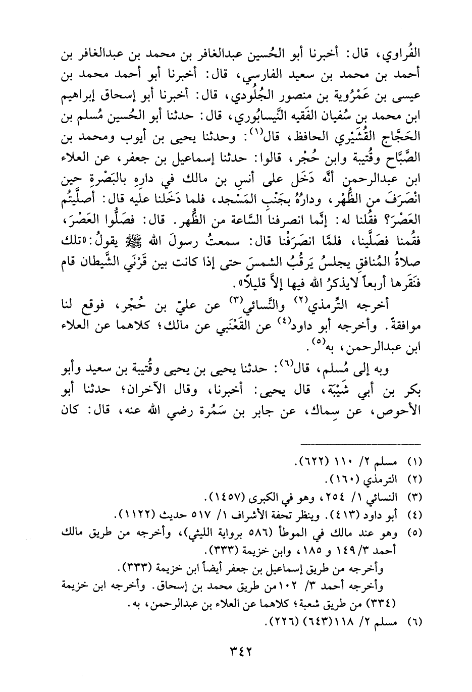 الْفُرَاوِيُّ، قَالَ: أَخْبَرَنَا أَبُو الْحُسَيْنِ عَبْدُ الْغَافِرِ بْنُ مُحَمَّدِ بْنِ عَبْدِ الْغَافِرِ بْنِ أَحْمَدَ بْنِ مُحَمَّدِ بْنِ سَعِيدٍ الْفَارِسِيِّ، قَالَ: أَخْبَرَنَا أَبُو أَحْمَدَ مُحَمَّدُ بْنُ عِيسَى بْنِ عَمْرَوَيْهِ بْنِ مَنْصُورٍ الْجُلُودِيُّ، قَالَ: أَخْبَرَنَا أَبُو إِسْحَاقَ إِبْرَاهِيمُ بْنُ مُحَمَّدِ بْنِ سُفْيَانَ الْفَقِيهُ النَّيْسَابُورِيُّ، قَالَ: حَدَّثَنَا أَبُو الْحُسَيْنِ مُسْلِمُ بْنُ الْحَجَّاجِ الْقُشَيْرِيُّ الْحَافِظُ، قَالَ: وَحَدَّثَنَا يَحْيَى بْنُ أَيُّوبَ وَمُحَمَّدُ بْنُ الصَّبَّاحِ وَقُتَيْبَةُ وَابْنُ حُجْرٍ، قَالُوا: حدثنا إسماعيل بن جعفر، عن العلاء ابن عَبْدِ الرَّحْمَنِ أَنَّهُ دَخَلَ عَلَى أنسٍ بْنِ مَالِكٍ فِي دَارِهِ بِالْبَصْرَةِ حِينَ انْصَرَفَ مِنَ الظُّهْرِ، وَدَارُهُ بِجَنْبِ الْمَسْجِدِ، فَلَمَّا دَخَلْنَا عَلَيْهِ قَالَ: أَصَلَّيْتُمُ الْعَصْرَ؟ فَقُلْنَا لَهُ: إِنَّمَا انْصَرَفْنَا السَّاعَةَ مِنَ الظُّهْرِ. قَالَ: فَصَلَّوُا الْعَصْرَ، فَقُمْنَا، فَصَلَّيْنَا، فَلَمَّا انْصَرَفْنَا قَالَ: سَمِعْتُ رَسُولَ اللَّهِ صَلَّى اللَّهُ عَلَيْهِ وَسَلَّمَ يَقُولُ: ((تِلْكَ صَلاةُ الْمُنَافِقِ يَجْلِسُ يَرْقُبُ الشَّمْسَ حَتَّى إِذَا كَانَتْ بَيْنَ قَرْنَيِ الشَّيْطَانِ قَامَ فَنَقَرَهَا أَرْبَعًا لا يَذْكُرُ اللَّهَ فِيهَا إِلا قَلِيلا)) .