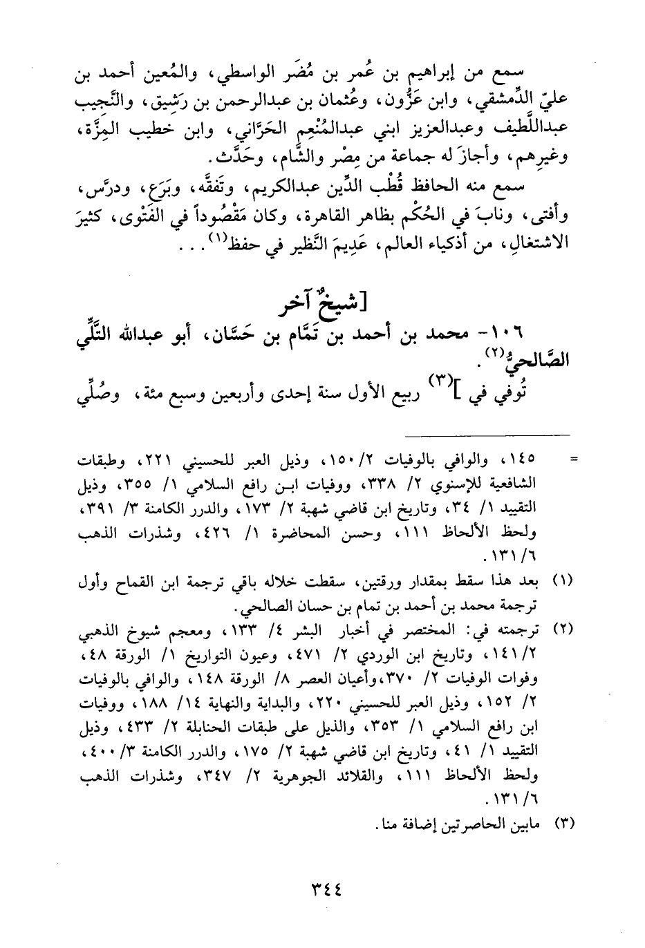 106- مُحَمَّدُ بْنُ أَحْمَدَ بْنِ تَمَّامِ بْنِ حَسَّانٍ، أَبُو عَبْدِ اللَّهِ التَّلِّيُّ الصَّالِحِيُّ.