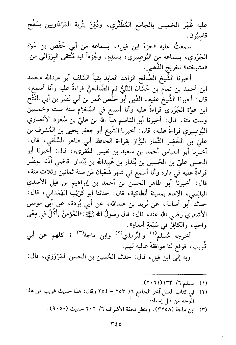 أَخْبَرَنَا الشَّيْخُ الصَّالِحُ الزَّاهِدُ الْعَابِدُ بَقِيَّةُ السَّلَفِ أَبُو عَبْدِ اللَّهِ مُحَمَّدُ بْنُ أَحْمَدَ بْنِ تَمَّامٍ بْنِ حَسَّانٍ التَّلِّيُّ ثُمَّ الصَّالِحِيُّ قِرَاءَةً عَلَيْهِ وَأَنَا أَسْمَعُ، قَالَ: أَخْبَرَنَا الشَّيْخُ عَفِيفُ الدِّينِ أَبُو حَفْصٍ عُمَرُ بْنُ أَبِي نَصْرِ بْنِ أبي الفتح ابن عَوَّةَ الْجَزَرِيُّ قِرَاءَةً عَلَيْهِ وَأَنَا أَسْمَعُ فِي المحرم سنة ست وخمسين وست مئة، قَالَ: أَخْبَرَنَا أَبُو الْقَاسِمِ هِبَةُ اللَّهِ بْنُ عَلِيِّ بْنِ سُعُودٍ الأَنْصَارِيُّ الْبُوصِيرِيُّ قِرَاءَةً عَلَيْهِ، قَالَ: أَخْبَرَنَا الشَّيْخُ أَبُو جَعْفَرٍ يَحْيَى بْنُ الْمُشْرِفِ بْنِ عَلِيِّ بْنِ الْخَضِرِ التَّمَّارُ الْبَزَّازُ بِقِرَاءَةِ الْحَافِظِ أَبِي طَاهِرٍ السِّلَفِيِّ، قَالَ: أَخْبَرَنَا أَبُو الْعَبَّاسِ أَحْمَدُ بْنُ سَعِيدِ بْنِ نَفِيسٍ الْمُقْرِئُ، قَالَ: أَخْبَرَنَا أَبُو الْحَسَنِ عَلِيُّ بْنُ الْحُسَيْنِ بْنِ بُنْدَارِ بْنِ عُبَيْدِ اللَّهِ بْنِ بُنْدَارٍ قَاضِي أَذَنَةَ بِمِصْرَ قِرَاءَةً عَلَيْهِ فِي دَارِهِ وَأَنَا أَسْمَعُ فِي شَهْرِ شَعْبَانَ مِنْ سنة ثمانين وثلاث مئة، قَالَ: أَخْبَرَنَا أَبُو طَاهِرٍ الْحَسَنُ بْنُ أَحْمَدَ بْنِ إِبْرَاهِيمَ بْنِ فِيلٍ الأَسَدِيُّ الْبَالِسِيُّ، الإِمَامُ بِمَدِينَةِ أَنْطَاكِيَةَ، قَالَ: حَدَّثَنَا أَبُو كُرَيْبٍ الْهَمْدَانِيُّ، قَالَ: حَدَّثَنَا أَبُو أُسَامَةَ، عَنْ بُرَيْدِ بْنِ عَبْدِ اللَّهِ، عَنْ أَبِي بُرْدَةَ، عَنْ أَبِي مُوسَى الأَشْعَرِيِّ رَضِيَ اللَّهُ عَنْهُ، قَالَ: قَالَ رَسُولُ اللَّهِ صَلَّى اللَّهُ عَلَيْهِ وَسَلَّمَ: ((الْمُؤْمِنُ يَأْكُلُ فِي مِعًى واحدٍ، وَالْكَافِرُ فِي سَبْعَةِ أمعاءٍ)) .