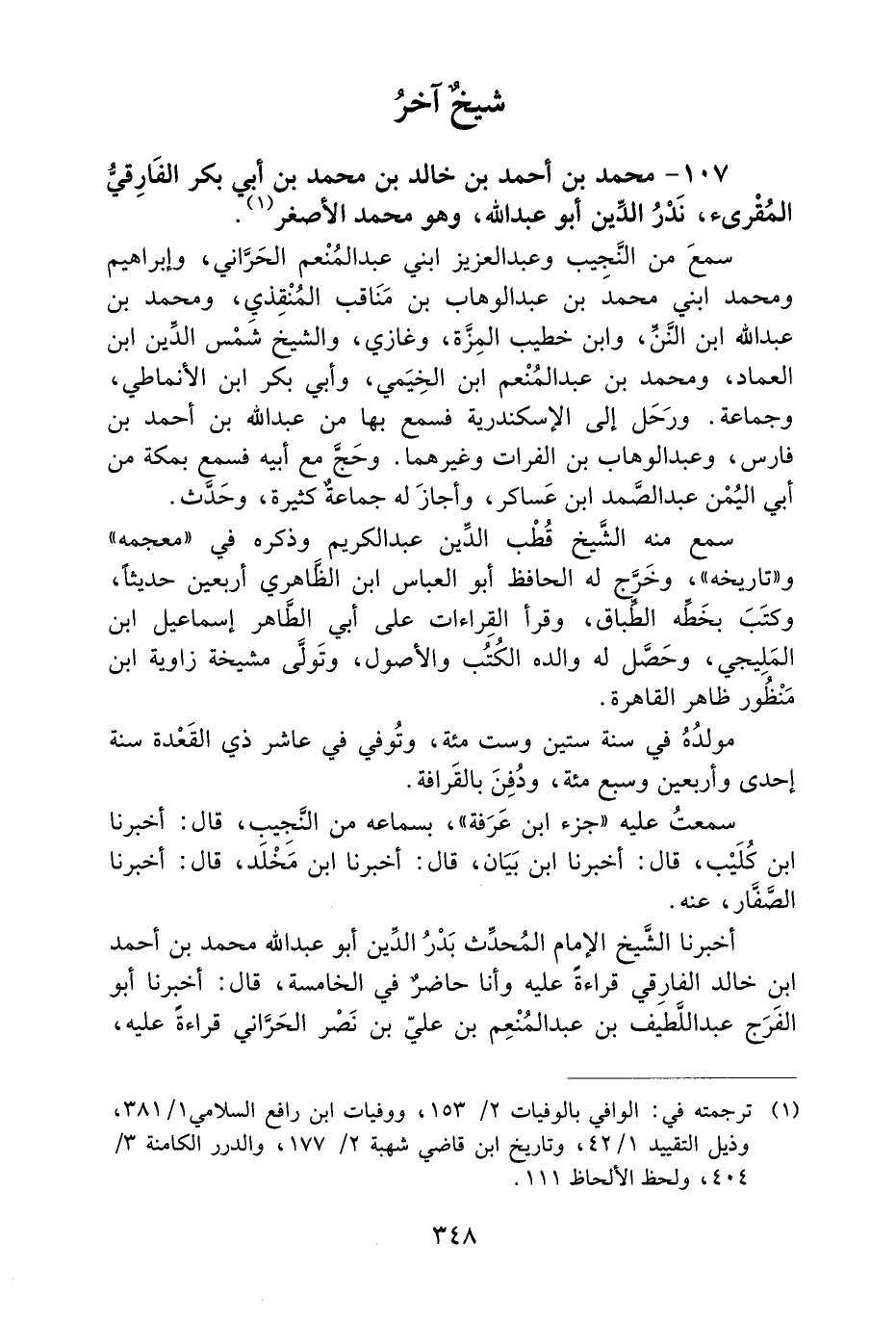 107- مُحَمَّدُ بْنُ أَحْمَدَ بْنِ خَالِدِ بْنِ مُحَمَّدِ بْنِ أَبِي بَكْرٍ الْفَارِقِيُّ الْمُقْرِئُ، ندر الدِّينِ أَبُو عَبْدِ اللَّهِ، وَهُوَ مُحَمَّدٌ الأَصْغَرُ.