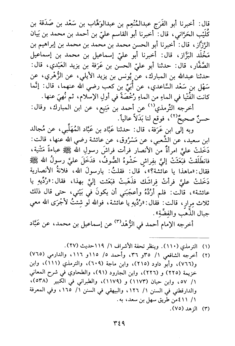 وَبِهِ إِلَى ابْنِ عَرَفَةَ، قَالَ: حَدَّثَنَا عَبَّادُ بْنُ عَبَّادٍ الْمُهَلَّبِيُّ، عَنْ مُجَالِدِ بْنِ سَعِيدٍ، عَنِ الشَّعْبِيِّ، عَنْ مَسْرُوقٍ، عَنْ عَائِشَةَ رَضِيَ اللَّهُ عَنْهَا، قَالَتْ: دَخَلَتْ عَلَيَّ امرأةٌ مِنَ الأَنْصَارِ فَرَأَتْ فِرَاشَ رَسُولِ اللَّهِ صَلَّى اللَّهُ عَلَيْهِ وَسَلَّمَ عَبَاءَةً مَثْنِيَّةً، فَانْطَلَقَتْ فَبَعَثَتْ إِلَيَّ بفراشٍ حَشْوُهُ الصُّوفُ، فَدَخَلَ عَلَيَّ رَسُولُ اللَّهِ صَلَّى اللَّهُ عَلَيْهِ وَسَلَّمَ فَقَالَ: ((مَا هَذَا يَا عَائِشَةُ؟)) قَالَ: فَقُلْتُ: يَا رَسُولَ اللَّهِ، فُلانَةٌ الأَنْصَارِيَّةُ دخلت علي فرأت فراشك ذهبت فَبَعَثَتْ إِلَيَّ بِهَذَا، فَقَالَ: ((رُدِّيهِ يَا عَائِشَةُ)) ، قَالَتْ: فَلَمْ أَرُدَّهُ وَأَعْجَبَنِي أَنْ يَكُونَ فِي بَيْتِي، حَتَّى قَالَ ذَلِكَ ثَلاثَ مرارٍ، قَالَتْ: فَقَالَ ((رُدِّيهِ يَا عَائِشَةُ فَوَاللَّهِ لَوْ شِئْتُ لأَجْرَى اللَّهُ مَعِي جِبَالَ الذَّهَبِ وَالْفِضَّةِ)) .