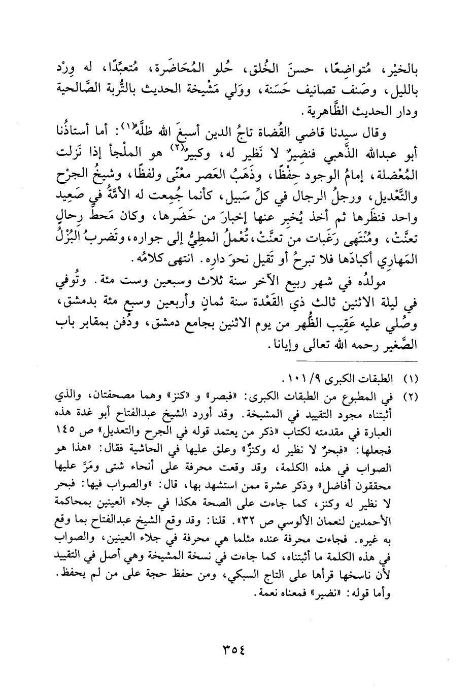 وَقَالَ سَيِّدُنَا قَاضِي الْقُضَاةِ تَاجُ الدِّينِ أَسْبَغَ اللَّهُ ظِلَّهُ: أَمَّا أُسْتَاذُنَا أَبُو عَبْدِ اللَّهِ الذَّهَبِيُّ فنضيرٌ لا نَظِيرَ لَهُ، وكبيرٌ هُوَ الْمَلْجَأُ إِذَا نَزَلَتِ الْمُعْضِلَةُ، إِمَامُ الْوُجُودِ حِفْظًا، وَذَهَبُ الْعَصْرِ مَعْنًى وَلَفْظًا، وَشَيْخُ الْجَرْحِ وَالتَّعْدِيلِ، وَرَجُلُ الرِّجَالِ فِي كُلِّ سَبِيلٍ، كَأَنَّمَا جُمِعَتْ لَهُ الأُمَّةُ فِي صعيدٍ وَاحِدٍ فَنَظَرَهَا ثُمَّ أَخَذَ يُخْبِرُ عَنْهَا إِخْبَارَ مَنْ حَضَرَهَا، وَكَانَ مَحَطَّ رِحَالٍ تَعَنَّتْ، وَمُنْتَهَى رَغَبَاتِ مَنْ تَعَنَّتَ، تُعْمَلُ الْمَطِيُّ إِلَى جِوَارِهِ، وَتَضْرِبُ الْبُزْلُ الْمَهَارِيُّ أَكْبَادَهَا فَلا تَبْرَحُ أَوْ تُقِيلُ نَحْوَ دَارِهِ. انْتَهَى كَلامُهُ.