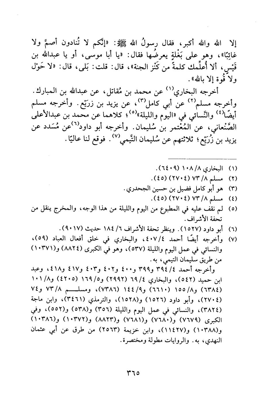 إِلا اللَّهُ وَاللَّهُ أَكْبَرُ، فَقَالَ رَسُولُ اللَّهِ صَلَّى اللَّهُ عَلَيْهِ وَسَلَّمَ: ((إِنَّكُمْ لا تُنَادُونَ أصم ولا غائباً)) ، وهو على بلغةٍ يَعْرِضُهَا فَقَالَ: ((يَا أَبَا مُوسَى، أَوْ يَا عَبْدَ اللَّهِ بْنَ قَيْسٍ، أَلا أُعَلِّمُكَ كَلِمَةً مِنْ كَنْزِ الْجَنَّةِ)) ، قَالَ: قُلْتُ: بَلَى، قَالَ: ((لا حَوْلَ وَلا قُوَّةَ إِلا بِاللَّهِ)) .
