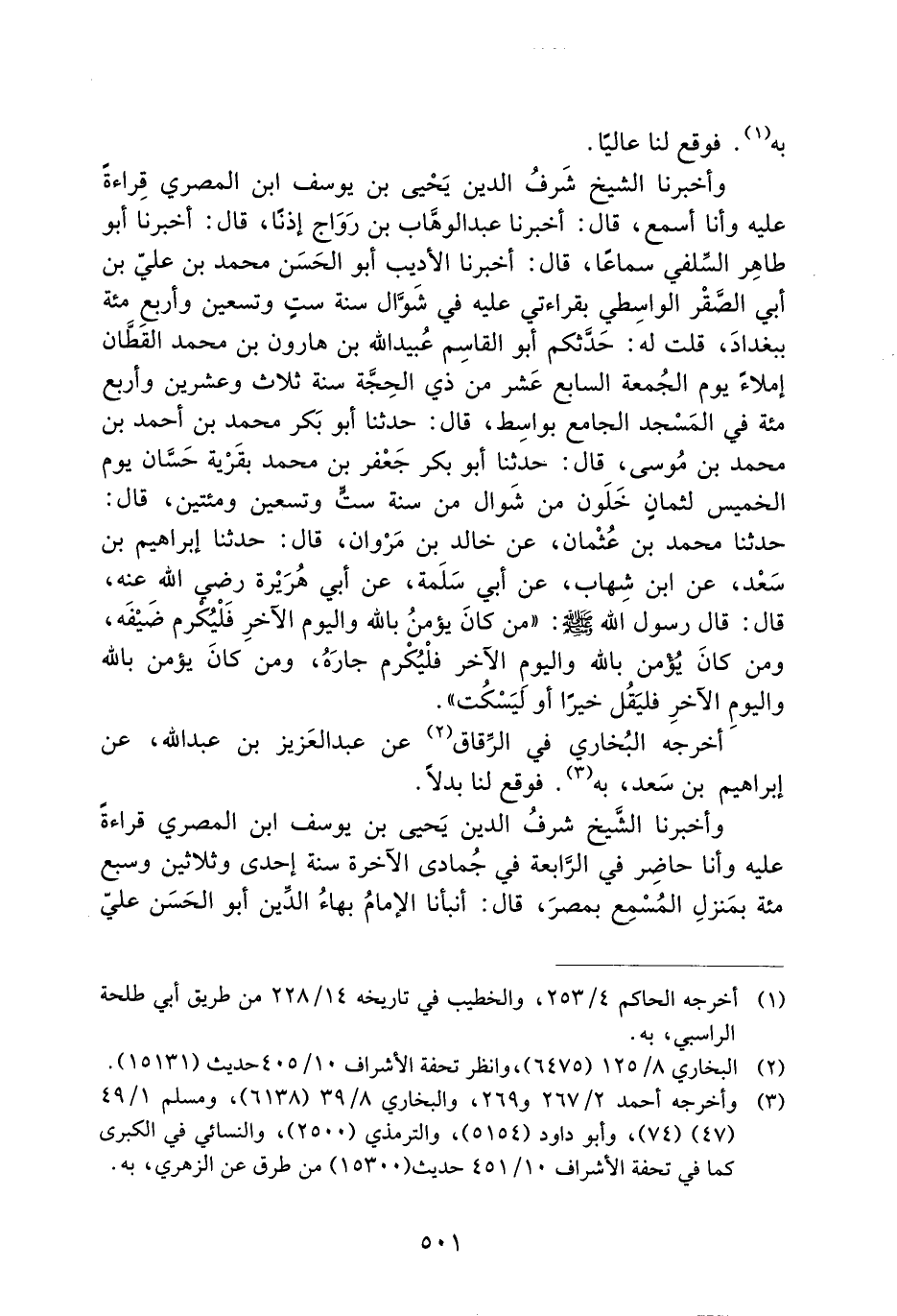 وَأَخْبَرَنَا الشَّيْخُ شَرَفُ الدِّينِ يَحْيَى بْنُ يُوسُفَ ابْنِ الْمِصْرِيِّ قِرَاءَةً عَلَيْهِ وَأَنَا أَسْمَعُ، قَالَ: أَخْبَرَنَا عَبْدُ الْوَهَّابِ بْنُ رَوَّاجٍ إِذْنًا، قَالَ: أَخْبَرَنَا أَبُو طَاهِرٍ السِّلَفِيُّ سَمَاعًا، قَالَ: أَخْبَرَنَا الأَدِيبُ أَبُو الْحَسَنِ مُحَمَّدُ بْنُ عَلِيِّ بْنِ أَبِي الصَّقْرِ الْوَاسِطِيُّ بِقِرَاءَتِي عَلَيْهِ فِي شَوَّالٍ سَنَةَ ستٍ وَتِسْعِينَ وأربع مئة بِبَغْدَادَ، قُلْتُ لَهُ: حَدَّثَكُمْ أَبُو الْقَاسِمِ عُبَيْدُ اللَّهِ بْنُ هَارُونَ بْنِ مُحَمَّدٍ الْقَطَّانُ إِمْلاءً يَوْمَ الْجُمُعَةِ السَّابِعَ عَشَرَ مِنْ ذِي الْحَجَّةِ سنة ثلاث وعشرين وأربعمائة فِي الْمَسْجِدِ الْجَامِعِ بِوَاسِطَ، قَالَ: حَدَّثَنَا أَبُو بَكْرٍ مُحَمَّدُ بْنُ أَحْمَدَ بْنِ مُحَمَّدِ بْنِ مُوسَى، قَالَ: حَدَّثَنَا أَبُو بَكْرٍ جَعْفَرُ بْنُ مُحَمَّدٍ بِقَرْيَةِ حَسَّانٍ يَوْمَ الْخَمِيسِ لثمانٍ خَلَوْنَ من شوال من سنة ستٍ وتسعين ومئتين، قَالَ: حَدَّثَنَا مُحَمَّدُ بْنُ عُثْمَانَ، عَنْ خَالِدِ بْنِ مَرْوَانَ، قَالَ: حَدَّثَنَا إِبْرَاهِيمُ بْنُ سَعْدٍ، عَنِ ابْنِ شِهَابٍ، عَنْ أَبِي سَلَمَةَ، عَنْ أَبِي هُرَيْرَةَ رَضِيَ اللَّهُ عَنْهُ، قَالَ: قَالَ رَسُولُ اللَّهِ صَلَّى اللَّهُ عَلَيْهِ وَسَلَّمَ: ((مَنْ كَانَ يُؤْمِنُ بِاللَّهِ وَالْيَوْمِ الآخِرِ فَلْيُكْرِمْ ضَيْفَهُ، وَمَنْ كَانَ يُؤْمِنُ بِاللَّهِ وَالْيَوْمِ الآخِرِ فَلْيُكْرِمْ جَارَهُ، وَمَنْ كَانَ يُؤْمِنُ بِاللَّهِ وَالْيَوْمِ الآخِرِ فَلْيَقُلْ خَيْرًا أَوْ لِيَسْكُتْ)) .