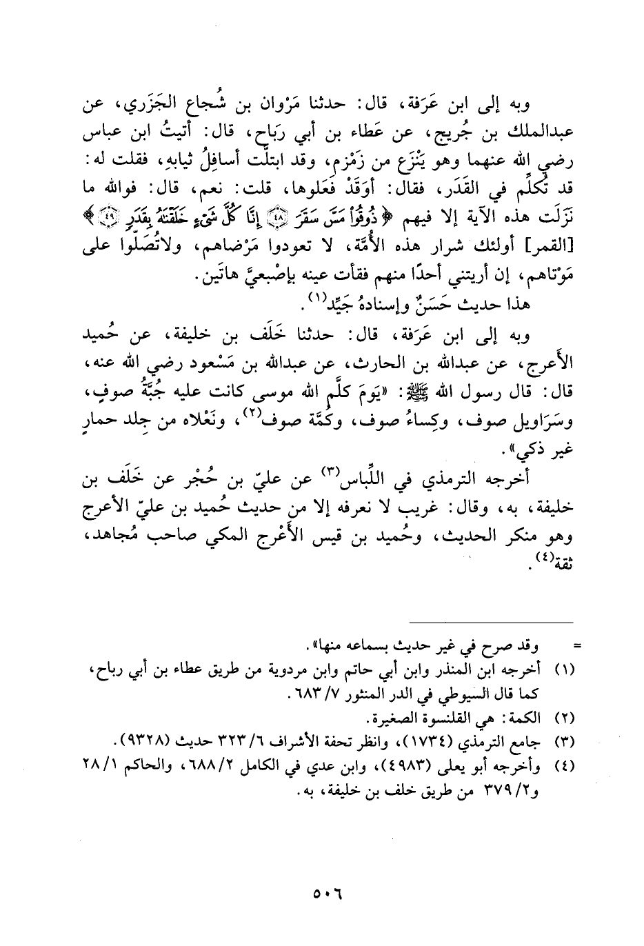 وبه على ابْنِ عَرَفَةَ، قَالَ: حَدَّثَنَا خَلَفُ بْنُ خَلِيفَةَ، عَنْ حُمَيْدٍ الأَعْرَجِ، عَنْ عَبْدِ اللَّهِ بْنِ الْحَارِثِ، عَنْ عَبْدِ اللَّهِ بْنِ مَسْعُودٍ رَضِيَ اللَّهُ عَنْهُ، قَالَ: قَالَ رَسُولُ اللَّهِ صَلَّى اللَّهُ عَلَيْهِ وَسَلَّمَ: ((يَوْمَ كَلَّمَ اللَّهُ مُوسَى كَانَتْ عَلَيْهِ جُبَّةُ صوفٍ، وَسَرَاوِيلُ صُوفٍ، وَكِسَاءُ صُوفٍ، وَكُمَّةُ صُوفٍ، وَنَعْلاهُ مِنْ جِلْدِ حِمَارٍ غَيِّر ذَكِيٍّ)) .