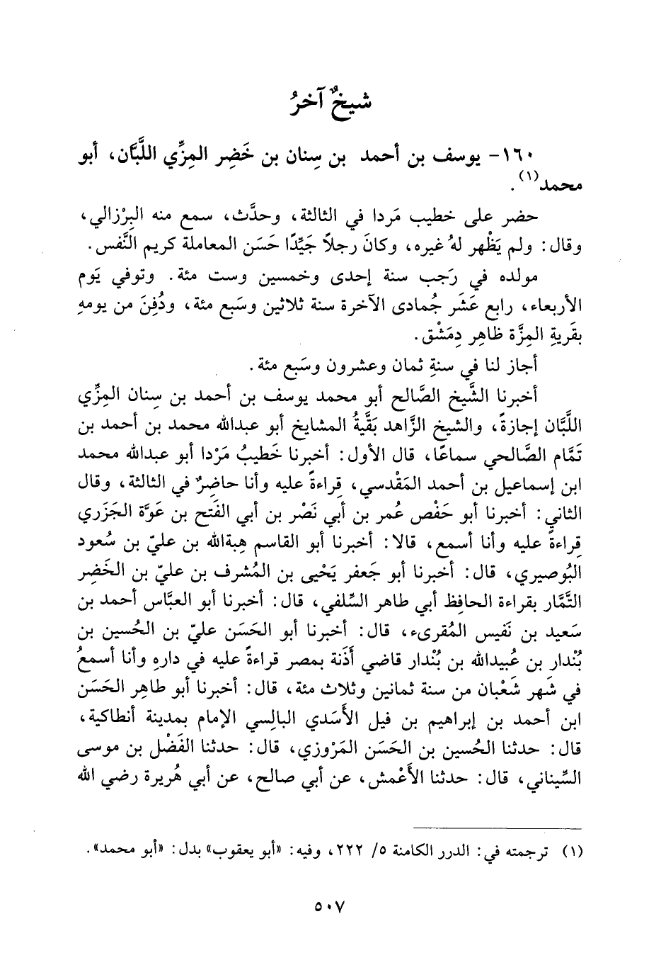 160- يُوسُفُ بْنُ أَحْمَدَ بْنِ سِنَانِ بْنِ خَضِرٍ الْمِزِّيُّ اللَّبَّانُ، أَبُو مُحَمَّدٍ.