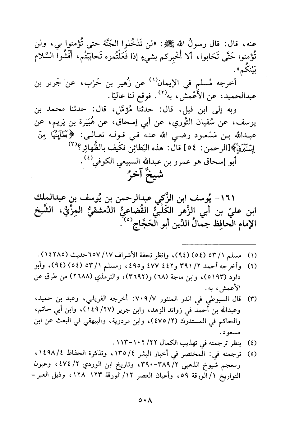 أَخْرَجَهُ مُسْلِمٌ فِي الإِيمَانِ عَنْ زُهَيْرِ بْنِ حَرْبٍ، عَنْ جَرِيرِ بْنِ عَبْدِ الْحَمِيدِ، عَنِ الأَعْمَشِ، بِهِ. فَوَقَعَ لَنَا عَالِيًا.