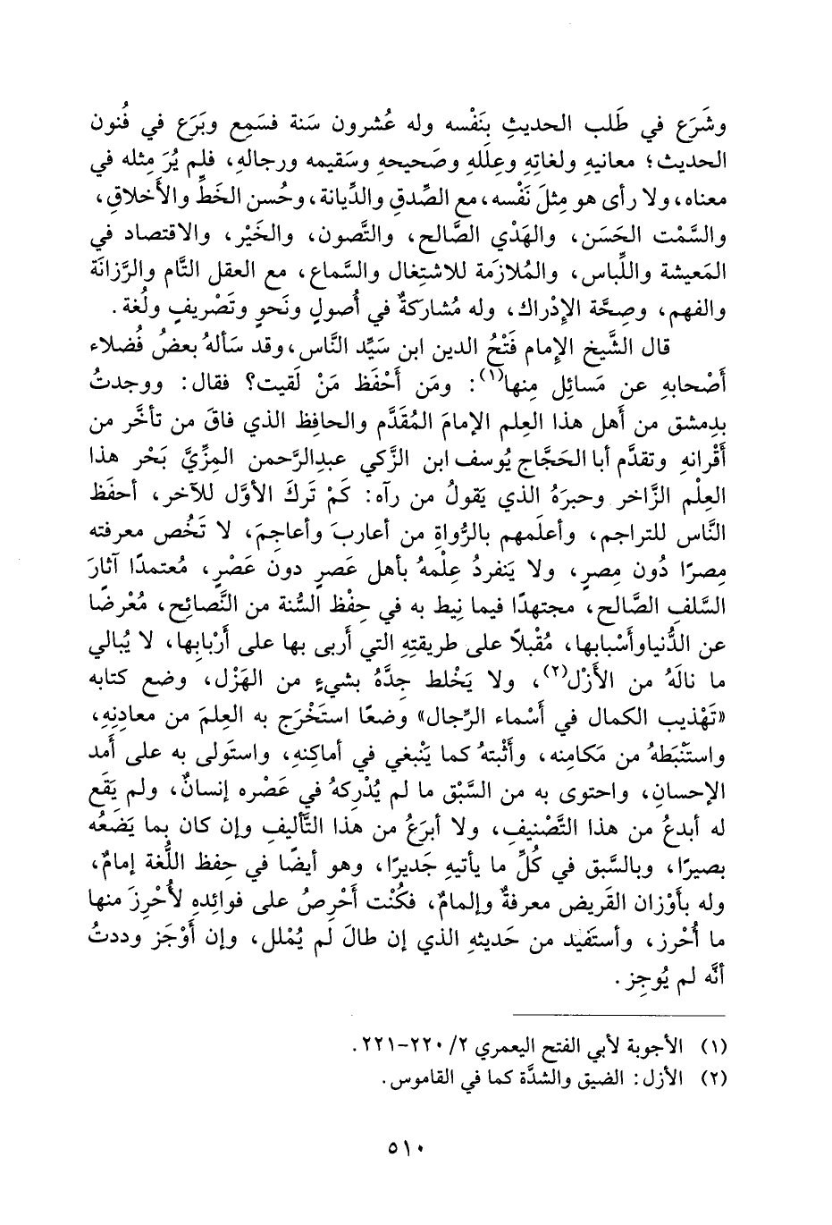 قَالَ الشَّيْخُ الإِمَامُ فَتْحُ الدِّينِ ابْنُ سَيِّدِ النَّاسِ، وَقَدْ سَأَلَهُ بَعْضُ فُضَلاءِ أَصْحَابِهِ عَنْ مَسَائِلَ مِنْهَا: وَمَنْ أَحْفَظُ مَنْ لَقِيتَ؟ فَقَالَ: وَوَجَدْتُ بِدِمَشْقَ مِنْ أَهْلِ هَذَا الْعِلْمِ الإِمَامَ الْمُقَدَّمَ وَالْحَافِظَ الَّذِي فَاقَ مَنْ تَأَخَّرَ مِنْ أَقْرَانِهِ وَتَقَدَّمَ أَبَا الْحَجَّاجِ يُوسُفَ ابْنَ الزَّكِيِّ عَبْدِ الرَّحْمَنِ الْمِزِّيَّ بَحْرَ هَذَا الْعِلْمِ الزَّاخِرِ وَحَبْرَهُ الَّذِي يَقُولُ مَنْ رَآهُ: كَمْ تَرَكَ الأَوَّلُ لِلآخِرِ، أَحْفَظَ النَّاسِ لِلتَّرَاجِمِ، وَأَعْلَمَهُمْ بِالرُّوَاةِ مِنْ أَعَارِبَ وَأَعَاجِمَ، لا تَخُصُّ مَعْرِفَتُهُ مِصْرًا دُونَ مصرٍ، وَلا يَنْفَرِدُ عِلْمُهُ بِأَهْلِ عصرٍ دُونَ عصرٍ، مُعْتَمِدًا آثَارَ السَّلَفِ الصَّالِحِ، مُجْتَهِدًا فِيمَا نِيطَ بِهِ فِي حِفْظِ السُّنَّةِ مِنَ النَّصَائِحِ، مُعْرِضًا عَنِ الدُّنْيَا وَأَسْبَابِهَا، مُقْبِلا عَلَى طَرِيقَتِهِ الَّتِي أَرْبَى بِهَا عَلَى أَرْبَابِهَا، لا يُبَالِي مَا نَالَهُ مِنَ الأَزْلِ، وَلا يَخْلِطُ جِدَّهُ بشيءِ مِنَ الْهَزْلِ، وَضَعَ كِتَابَهُ ((تَهْذِيبَ الْكَمَالِ فِي أَسْمَاءِ الرِّجَالِ)) وَضْعًا اسْتَخْرَجَ بِهِ الْعِلْمَ مِنْ مَعَادِنِهِ، وَاسْتَنْبَطَهُ مِنْ مَكَامِنِهِ، وَأَثْبَتَهُ كَمَا يَنْبَغِي فِي أَمَاكِنِهِ، وَاسْتَوْلَى بِهِ عَلَى أَمَدِ الإِحْسَانِ، وَاحْتَوَى بِهِ مِنَ السَّبْقِ مَا لَمْ يُدْرِكْهُ فِي عَصْرِهِ إنسانٌ، وَلَمْ يَقَعْ لَهُ أَبْدَعُ مِنْ هَذَا التَّصْنِيفِ، وَلا أَبْرَعُ مِنْ هَذَا التَّأْلِيفِ وَإِنْ كَانَ بِمَا يَضَعُهُ بَصِيرًا، وَبِالسَّبْقِ فِي كُلِّ مَا يَأْتِيهِ جَدِيرًا، وَهُوَ أَيْضًا فِي حِفْظِ اللُّغَةِ إمامٌ، وَلَهُ بِأَوْزَانِ الْقَرِيضِ معرفةٌ وإلمامٌ، فَكُنْتُ أَحْرِصُ عَلَى فَوَائِدِهِ لأُحْرِزَ مِنْهَا مَا أُحْرِزُ، وَأَسْتَفِيدَ مِنْ حَدِيثِهِ الذي إن طال لَمْ يُمْلَلْ، وَإِنْ أُوجَزَ وَدِدْتُ أَنَّهُ لَمْ يوجز.