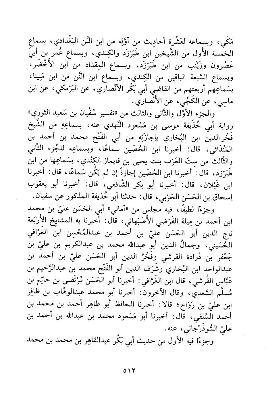 وَالْجُزْءَ الأَوَّلَ وَالثَّانِي وَالثَّالِثَ مِنْ ((تَفْسِيرِ سُفْيَانَ بْنِ سَعِيدٍ الثَّوْرِيِّ)) رِوَايَةَ أَبِي حُذَيْفَةَ مُوسَى بْنِ مَسْعُودٍ النَّهْدِيِّ عَنْهُ، بِسَمَاعِهِ مِنَ الشَّيْخِ فَخْرِ الدِّينِ ابْنِ الْبُخَارِيِّ بِإِجَازَتِهِ مِنْ أَبِي الْفَتْحِ مُحَمَّدِ بْنِ أَحْمَدَ بن المندائي، قال: أخبرنا أبو الْحُصَيْنِ سَمَاعًا، وَبِسَمَاعِهِ لِلْجُزْءَ الثَّانِي وَالثَّالِثِ مِنْ سِتِّ الْعَرَبِ بِنْتِ يَحْيَى بْنِ قَايْمَازَ الْكِنْدِيِّ، بِسَمَاعِهَا مِنَ ابْنِ طَبَرْزَدَ، قَالَ: أَخْبَرَنَا ابْنُ الْحُصَيْنِ إِجَازَةً إِنْ لَمْ يَكُنْ سَمَاعًا، قَالَ: أَخْبَرَنَا ابْنُ غَيْلانَ، قَالَ: أَخْبَرَنَا أَبُو بَكْرٍ الشَّافِعِيُّ، قَالَ: أَخْبَرَنَا أَبُو يَعْقُوبَ إِسْحَاقُ بْنُ الْحَسَنِ الْحَرْبِيُّ، قَالَ: حَدَّثَنَا أَبُو حُذَيْفَةَ الْمَذْكُورُ عَنْ سُفْيَانَ.
