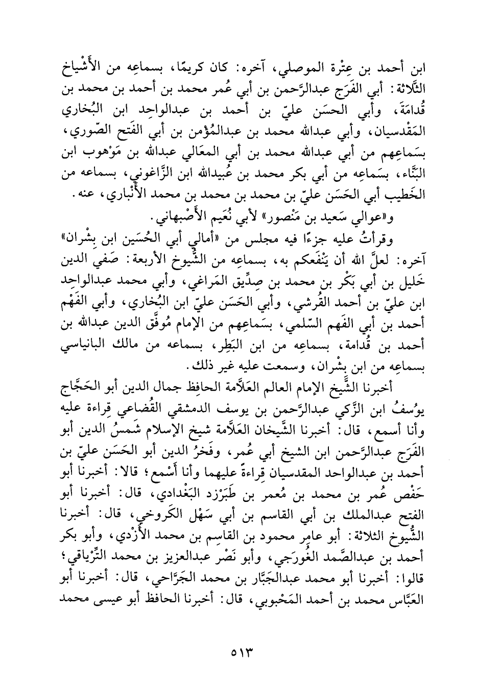 وَقَرَأْتُ عَلَيْهِ جُزْءًا فِيهِ مَجْلِسٌ مِنْ ((أَمَالِي أَبِي الْحُسَيْنِ ابْنِ بِشْرَانَ)) آخِرُهُ: لَعَلَّ اللَّهَ أَنْ يَنْفَعَكُمْ بِهِ، بِسَمَاعِهِ مِنَ الشُّيُوخِ الأَرْبَعَةِ: صَفِيِّ الدِّينِ خَلِيلِ بْنِ أَبِي بَكْرِ بْنِ مُحَمَّدِ بْنِ صِدِّيقٍ الْمَرَاغِيِّ، وَأَبِي مُحَمَّدٍ عَبْدِ الْوَاحِدِ ابن عَلِيِّ بْنِ أَحْمَدَ الْقُرَشِيِّ، وَأَبِي الْحَسَنِ عَلِيِّ ابْنِ الْبُخَارِيِّ، وَأَبِي الْفَهْمِ أَحْمَدَ بْنِ أَبِي الْفَهْمِ السُّلَمِيِّ، بِسَمَاعِهِمْ مِنَ الإِمَامِ مُوَفَّقِ الدِّينِ عَبْدِ اللَّهِ بْنِ أَحْمَدَ بْنِ قُدَامَةَ، بِسَمَاعِهِ مِنَ ابْنِ الْبَطِرِ، بِسَمَاعِهِ مِنْ مَالِكٍ الْبَانِيَاسِيِّ بِسَمَاعِهِ مِنَ ابْنِ بِشْرَانَ، وَسَمِعْتُ عَلَيْهِ غَيْرَ ذَلِكَ.