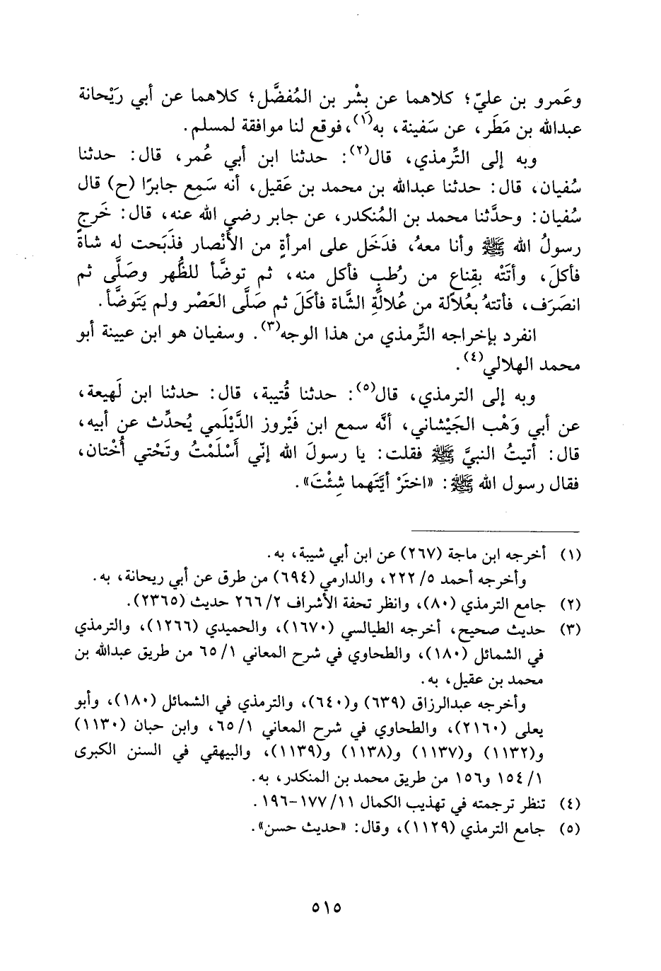 وَبِهِ إِلَى التِّرْمِذِيِّ، قَالَ: حَدَّثَنَا ابْنُ أَبِي عُمَرَ، قَالَ: حَدَّثَنَا سُفْيَانُ، قَالَ: حَدَّثَنَا عَبْدُ اللَّهِ بْنُ مُحَمَّدِ بْنِ عَقِيلٍ، أَنَّهُ سَمِعَ جَابِرًا (ح) قَالَ سُفْيَانُ: وحَدَّثَنَا مُحَمَّدُ بْنُ الْمُنْكَدِرِ، عَنْ جَابِرٍ رَضِيَ اللَّهُ عَنْهُ، قَالَ: خَرَجَ رَسُولُ اللَّهِ صَلَّى اللَّهُ عَلَيْهِ وَسَلَّمَ وَأَنَا مَعَهُ، فَدَخَلَ عَلَى امرأةٍ مِنَ الأَنْصَارِ فَذَبَحَتْ لَهُ شَاةً فَأَكَلَ، وَأَتَتْهُ بقناعٍ مِنْ رطبٍ فَأَكَلَ مِنْهُ، ثُمَّ تَوَضَّأَ لِلظُّهْرِ وَصَلَّى ثُمَّ انْصَرَفَ، فَأَتَتْهُ بِعُلالَةٍ مِنْ عُلالَةِ الشَّاةِ فَأَكَلَ ثُمَّ صَلَّى الْعَصْرَ وَلَمْ يَتَوَضَّأْ.