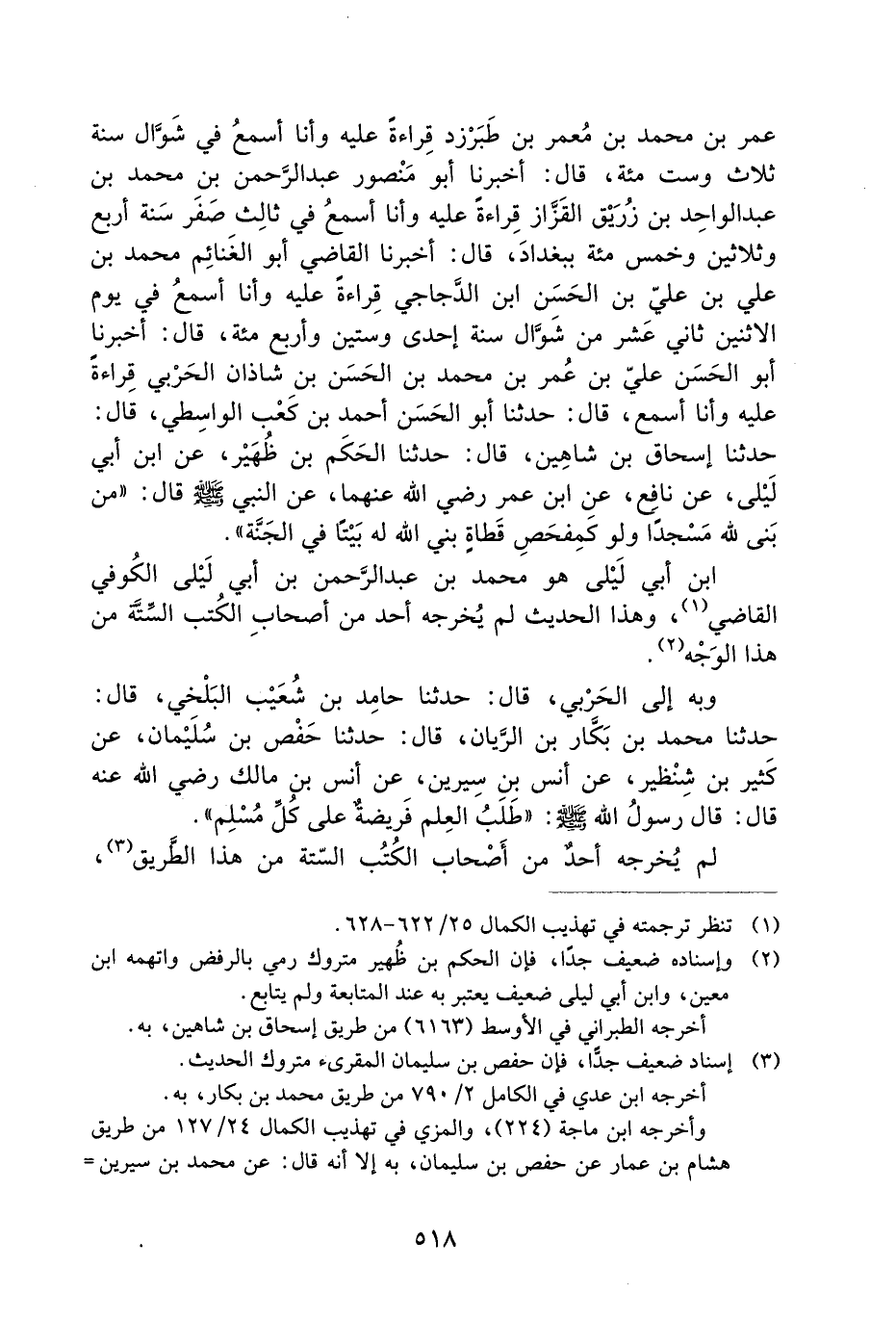 وَبِهِ إِلَى الْحَرْبِيِّ، قَالَ: حَدَّثَنَا حَامِدُ بْنُ شُعَيْبٍ الْبَلْخِيُّ، قَالَ: حَدَّثَنَا مُحَمَّدُ بْنُ بَكَّارِ بْنِ الرَّيَّانِ، قَالَ: حَدَّثَنَا حَفْصُ بْنُ سُلَيْمَانَ، عَنْ كَثِيرِ بْنِ شِنْظِيرٍ، عَنْ أَنَسِ بْنِ سِيرِينَ، عَنْ أَنَسِ بْنِ مَالِكٍ رَضِيَ اللَّهُ عَنْهُ قَالَ: قَالَ رَسُولُ اللَّهِ صَلَّى اللَّهُ عَلَيْهِ وَسَلَّمَ: ((طَلَبُ الْعِلْمِ فريضةٌ عَلَى كُلِّ مسلمٍ)) .
