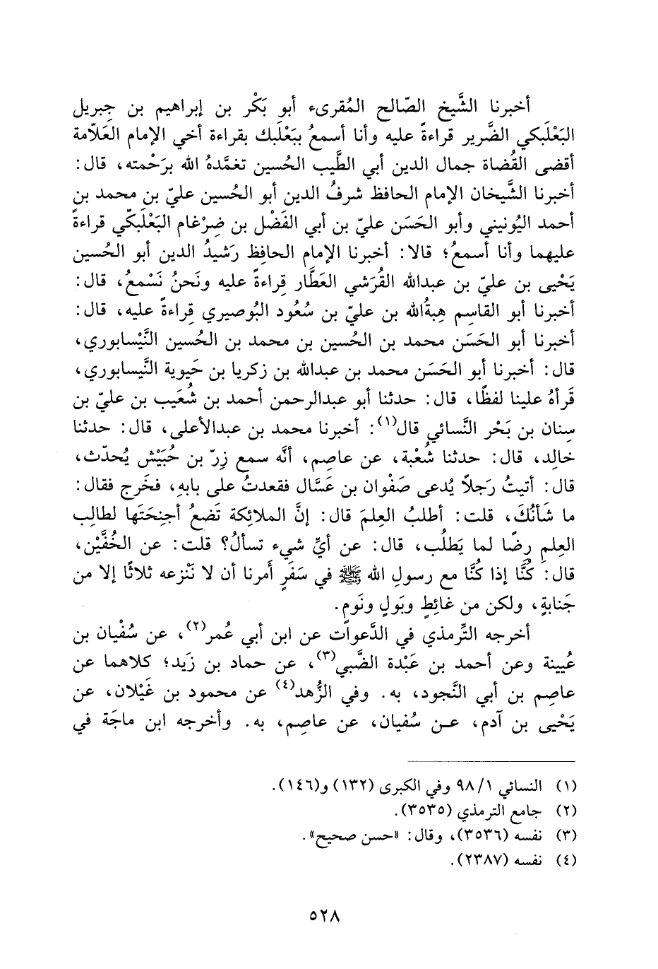 أَخْبَرَنَا الشَّيْخُ الصَّالِحُ الْمُقْرِئُ أَبُو بَكْرِ بْنُ إِبْرَاهِيمَ بْنِ جِبْرِيلَ الْبَعْلَبَكِّيُّ الضَّرِيرُ قِرَاءَةً عَلَيْهِ وَأَنَا أَسْمَعُ بِبَعْلَبَكَّ بِقِرَاءَةِ أَخِي الإِمَامِ الْعَلامَةِ أَقْضَى الْقُضَاةِ جَمَالِ الدِّينِ أَبِي الطِّيِّبِ الْحُسَيْنِ تَغَمَّدَهُ اللَّهُ بِرَحْمَتِهِ، قَالَ: أَخْبَرَنَا الشَّيْخَانِ الإِمَامُ الْحَافِظُ شَرَفُ الدِّينِ أَبُو الْحُسَيْنِ عَلِيُّ بْنُ مُحَمَّدِ بْنِ أَحْمَدَ الْيُونِينِيُّ وَأَبُو الْحَسَنِ عَلِيُّ بْنُ أَبِي الْفَضْلِ بْنِ ضِرْغَامٍ الْبَعْلَبَكِّيُّ قِرَاءَةً عَلَيْهِمَا وَأَنَا أَسْمَعُ؛ قَالا: أَخْبَرَنَا الإِمَامُ الْحَافِظُ رَشِيدُ الدِّينِ أَبُو الْحُسَيْنِ يَحْيَى بْنُ عَلِيِّ بْنِ عَبْدِ اللَّهِ الْقُرَشِيُّ الْعَطَّارُ قِرَاءَةً عَلَيْهِ وَنَحْنُ نَسْمَعُ، قَالَ: أَخْبَرَنَا أَبُو الْقَاسِمِ هِبَةُ اللَّهِ بْنُ عَلِيِّ بْنِ سُعُودٍ الْبُوصِيرِيُّ قِرَاءَةً عَلَيْهِ، قَالَ: أَخْبَرَنَا أَبُو الْحَسَنِ مُحَمَّدُ بْنُ الْحُسَيْنِ بْنِ مُحَمَّدِ بْنِ الْحُسَيْنِ النَّيْسَابُورِيُّ، قَالَ: أَخْبَرَنَا أَبُو الْحَسَنِ مُحَمَّدُ بْنُ عَبْدِ اللَّهِ بن زكريا بن حيوية النيسابوري، قرأه عَلَيْنَا لَفْظًا، قَالَ: حَدَّثَنَا أَبُو عَبْدِ الرَّحْمَنِ أَحْمَدُ بْنُ شُعَيْبِ بْنِ عَلِيِّ بْنِ سِنَانِ بْنِ بَحْرٍ النَّسَائِيُّ قَالَ: أَخْبَرَنَا مُحَمَّدُ بْنُ عَبْدِ الأَعْلَى، قَالَ: حَدَّثَنَا خَالِدٌ، قَالَ: حَدَّثَنَا شُعْبَةُ, عَنْ عَاصِمٍ أَنَّهُ سَمِعَ زِرَّ بْنَ حُبَيْشٍ يُحَدِّثُ، قَالَ: أَتَيْتُ رَجُلا يُدْعَى صَفْوَانَ بْنَ عَسَّالٍ فَقَعَدْتُ عَلَى بَابِهِ، فَخَرَجَ فَقَالَ: مَا شَأْنُكَ، قُلْتُ: أَطْلُبُ الْعِلْمَ قَالَ: إِنَّ الْمَلائِكَةَ تَضَعُ أَجْنِحَتَهَا لِطَالِبِ الْعِلْمِ رِضًا لِمَا يَطْلُبُ، قَالَ: عَنْ أَيِّ شَيْءٍ تَسْأَلُ؟ قُلْتُ: عَنِ الْخُفَّيْنِ، قَالَ: كُنَّا إِذَا كُنَّا مَعَ رَسُولِ اللَّهِ صَلَّى اللَّهُ عَلَيْهِ وَسَلَّمَ فِي سفرٍ أَمَرَنَا أَنْ لا نَنْزِعَهُ ثَلاثًا إِلا مِنْ جنابةٍ، وَلَكِنْ مِنْ غائطٍ وبولٍ ونومٍ.