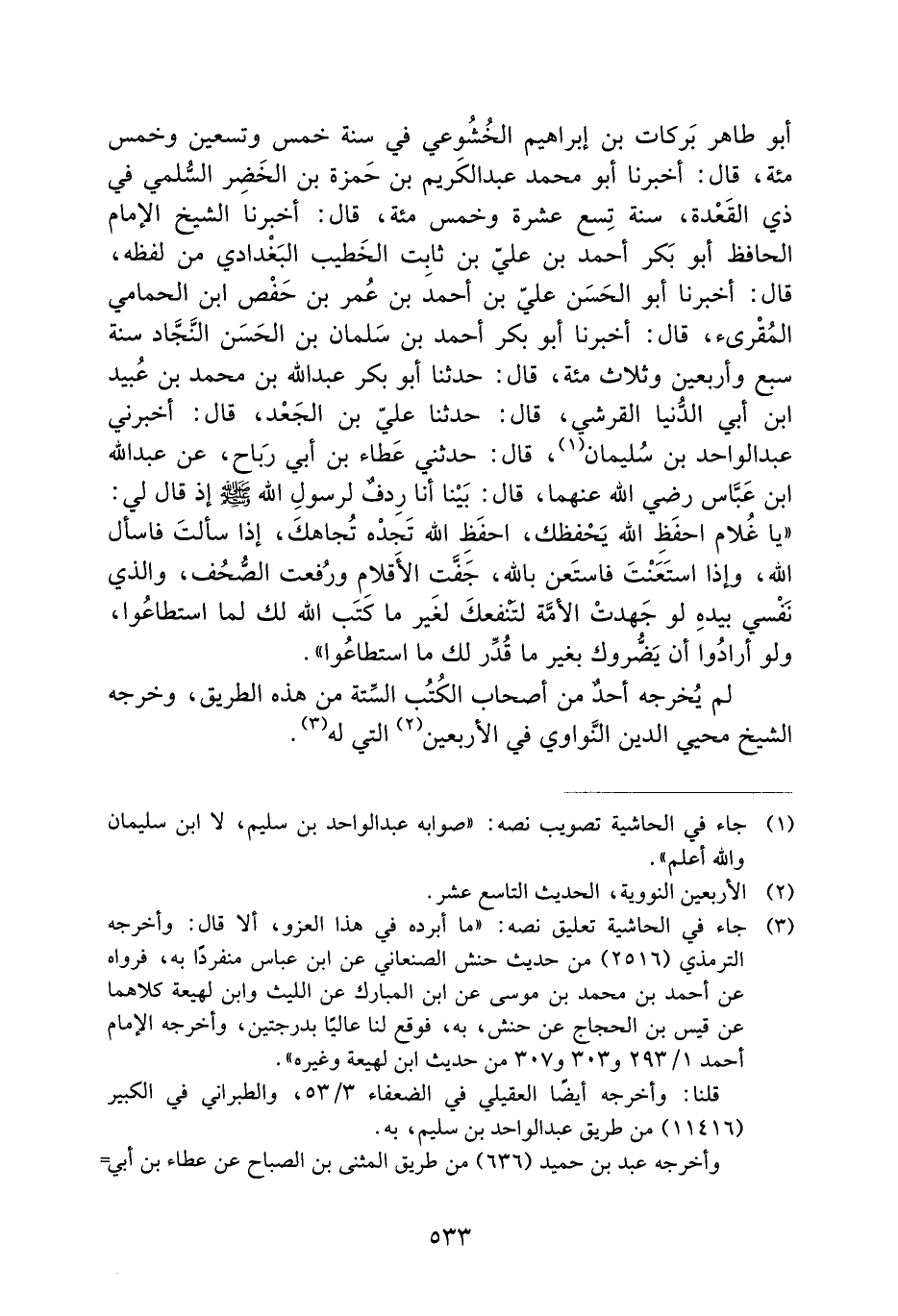 أَبُو طَاهِرٍ بَرَكَاتُ بْنُ إِبْرَاهِيمَ الْخُشُوعِيُّ فِي سنة خمس وتسعين وخمس مئة، قَالَ: أَخْبَرَنَا أَبُو مُحَمَّدٍ عَبْدُ الْكَرِيمِ بْنُ حَمْزَةَ بْنِ الْخَضِرِ السُّلَمِيُّ فِي ذِي الْقَعْدَةِ، سنة تسع عشرة وخمس مئة، قَالَ: أَخْبَرَنَا الشَّيْخُ الإِمَامُ الْحَافِظُ أَبُو بَكْرٍ أَحْمَدُ بْنُ عَلِيِّ بْنِ ثَابِتٍ الْخَطِيبُ الْبَغْدَادِيُّ مِنْ لَفْظِهِ، قَالَ: أَخْبَرَنَا أَبُو الْحَسَنِ عَلِيُّ بْنُ أَحْمَدَ بْنِ عُمَرَ بْنِ حَفْصِ ابْنِ الْحَمَّامِيِّ الْمُقْرِئُ، قَالَ: أَخْبَرَنَا أَبُو بَكْرٍ أَحْمَدُ بْنُ سَلْمَانَ بْنِ الْحَسَنِ النَّجَّادُ سَنَةَ سَبْعٍ وأربعين وثلاث مئة، قَالَ: حَدَّثَنَا أَبُو بَكْرٍ عَبْدُ اللَّهِ بْنُ مُحَمَّدِ بْنِ عُبَيْدِ ابْنِ أَبِي الدُّنْيَا الْقُرَشِيُّ، قَالَ: حَدَّثَنَا عَلِيُّ بْنُ الْجَعْدِ، قَالَ: أَخْبَرَنِي عَبْدُ الْوَاحِدِ بْنُ سُلَيْمَانَ، قَالَ: حَدَّثَنِي عَطَاءُ بْنُ أَبِي رَبَاحٍ، عَنْ عَبْدِ اللَّهِ بْنِ عباس رضي الله عنهما، قال: بينا أنا ردفٌ لرسول الله صَلَّى اللَّهُ عَلَيْهِ وَسَلَّمَ إِذْ قَالَ لِي: ((يَا غُلامُ احْفَظِ اللَّهَ يَحْفَظْكَ، احْفَظِ اللَّهَ تَجِدْهُ تِجَاهَكَ، إِذَا سَأَلْتَ فَاسْأَلِ اللَّهَ، وَإِذَا اسْتَعَنْتَ فَاسْتَعِنْ بِاللَّهِ، جَفَّتِ الأَقْلامُ وَرُفِعَتِ الصُّحُفُ، وَالَّذِي نَفْسِي بِيَدِهِ لَوْ جَهِدَتِ الأُمَّةُ لِتَنْفَعَكَ لِغَيْرِ مَا كَتَبَ اللَّهُ لَكَ لَمَا اسْتَطَاعُوا، وَلَوْ أَرَادُوا أَنْ يَضُرُّوكَ بِغَيْرِ مَا قُدِّرَ لَكَ مَا اسْتَطَاعُوا)) .