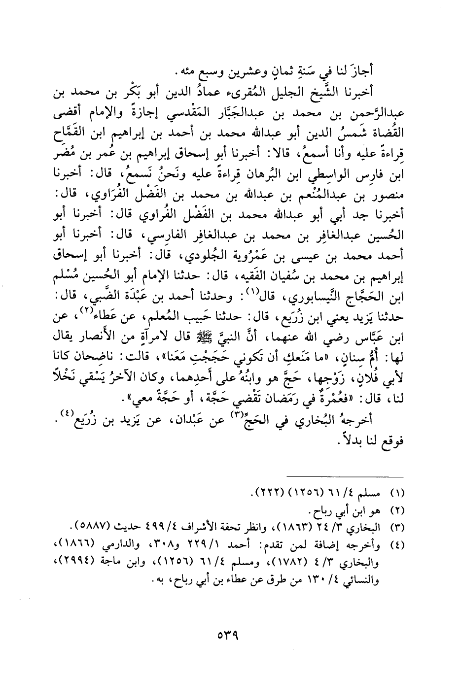 أَخْبَرَنَا الشَّيْخُ الْجَلِيلُ الْمُقْرِئُ عِمَادُ الدِّينِ أَبُو بَكْرِ بْنُ مُحَمَّدِ بْنِ عَبْدِ الرَّحْمَنِ بْنِ مُحَمَّدِ بْنِ عَبْدِ الْجَبَّارِ الْمَقْدِسِيُّ إِجَازَةً وَالإِمَامُ أَقْضَى الْقُضَاةِ شَمْسُ الدِّينِ أَبُو عَبْدِ اللَّهِ مُحَمَّدُ بْنُ أَحْمَدَ بْنِ إِبْرَاهِيمَ ابْنُ الْقَمَّاحِ قِرَاءَةً عَلَيْهِ وَأَنَا أَسْمَعُ، قَالا: أَخْبَرَنَا أَبُو إِسْحَاقَ إِبْرَاهِيمُ بْنُ عُمَرَ بْنِ مُضَرَ ابْنِ فَارِسٍ الْوَاسِطِيُّ ابْنُ الْبُرْهَانِ قِرَاءَةً عَلَيْهِ وَنَحْنُ نَسْمَعُ، قَالَ: أَخْبَرَنَا مَنْصُورُ بْنُ عَبْدِ الْمُنْعِمِ بْنِ عَبْدِ اللَّهِ بْنِ مُحَمَّدِ بْنِ الْفَضْلِ الْفُرَاوِيُّ، قَالَ: أَخْبَرَنَا جَدُّ أَبِي أَبُو عَبْدِ اللَّهِ مُحَمَّدُ بْنُ الْفَضْلِ الْفُرَاوِيُّ قَالَ: أَخْبَرَنَا أَبُو الْحُسَيْنِ عَبْدُ الْغَافِرِ بْنُ مُحَمَّدِ بْنِ عَبْدِ الْغَافِرِ الْفَارِسِيُّ، قَالَ: أَخْبَرَنَا أَبُو أَحْمَدَ مُحَمَّدُ بْنُ عِيسَى بْنِ عَمْرَوَيْهِ الْجُلُودِيُّ، قَالَ: أَخْبَرَنَا أَبُو إِسْحَاقَ إِبْرَاهِيمُ بْنُ مُحَمَّدِ بْنِ سُفْيَانَ الْفَقِيهُ، قَالَ: حَدَّثَنَا الإِمَامُ أَبُو الْحُسَيْنِ مُسْلِمُ بْنُ الْحَجَّاجِ النَّيْسَابُورِيُّ، قَالَ: وَحَدَّثَنَا أَحْمَدُ بْنُ عَبْدَةَ الضَّبِّيُّ، قَالَ: حَدَّثَنَا يَزِيدُ يَعْنِي ابن زريع، قال: حَدَّثَنَا حَبِيبٌ الْمُعَلِّمُ، عَنْ عَطَاءٍ، عَنِ ابْنِ عَبَّاسٍ رَضِيَ اللَّهُ عَنْهُمَا، أَنَّ النَّبِيَّ صَلَّى اللَّهُ عَلَيْهِ وَسَلَّمَ قَالَ لامرأةٍ مِنَ الأَنْصَارِ يُقَالُ لَهَا: أُمُّ سنانٍ، ((مَا مَنَعَكِ أَنْ تَكُونِي حَجَجْتِ مَعَنَا)) ، قَالَتْ: نَاضِحَانِ كَانَا لأَبِي فلانٍ، زَوْجِهَا، حَجَّ هُوَ وَابْنُهُ عَلَى أَحَدِهِمَا، وَكَانَ الآخَرُ يَسْقِي نَخْلا لَنَا، قَالَ: ((فعمرةٌ فِي رَمَضَانَ تَقْضِي حَجَّةً، أَوْ حَجَّةٌ مَعِي)) .