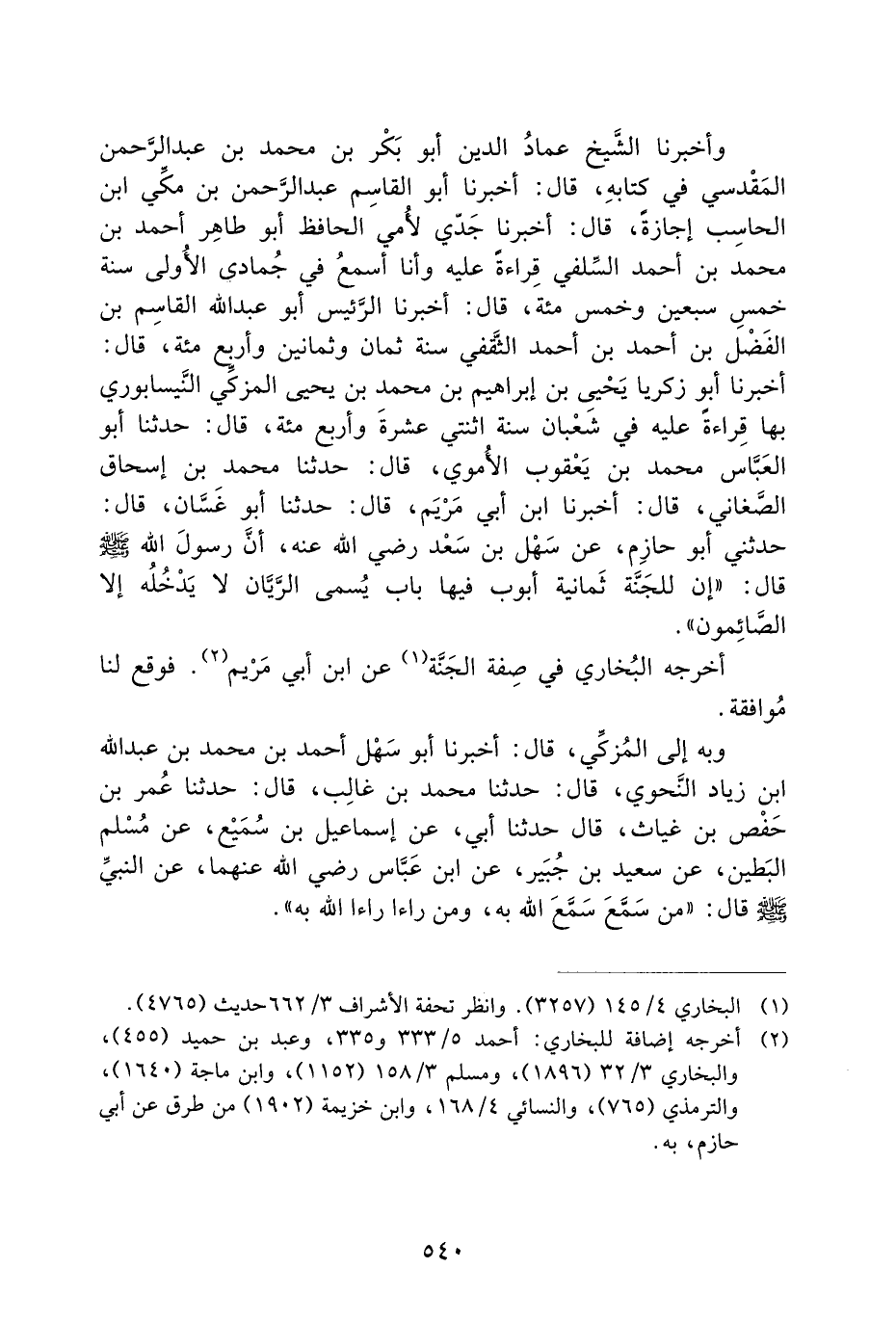 وَأَخْبَرَنَا الشَّيْخُ عِمَادُ الدِّينِ أَبُو بَكْرِ بْنُ مُحَمَّدِ بْنِ عَبْدِ الرَّحْمَنِ الْمَقْدِسِيُّ فِي كِتَابِهِ، قَالَ: أَخْبَرَنَا أَبُو الْقَاسِمِ عَبْدُ الرَّحْمَنِ بْنُ مَكِّيِّ ابْنِ الْحَاسِبِ إِجَازَةً، قَالَ: أَخْبَرَنَا جَدِّي لأُمِّي الْحَافِظُ أَبُو طَاهِرٍ أَحْمَدُ بْنُ مُحَمَّدِ بْنِ أَحْمَدَ السِّلَفِيُّ قِرَاءَةً عَلَيْهِ وَأَنَا أَسْمَعُ في جمادى الأولى سنة خمس سبعين وخمس مئة، قَالَ: أَخْبَرَنَا الرَّئِيسُ أَبُو عَبْدِ اللَّهِ الْقَاسِمُ بْنُ الْفَضْلِ بْنِ أَحْمَدَ بْنِ أَحْمَدَ الثَّقَفِيُّ سنة ثمان وثمانين وأربع مئة، قَالَ: أَخْبَرَنَا أَبُو زَكَرِيَّا يَحْيَى بْنُ إِبْرَاهِيمَ بْنِ مُحَمَّدِ بْنِ يَحْيَى الْمُزَكِّي النَّيْسَابُورِيُّ بِهَا قِرَاءَةً عَلَيْهِ فِي شَعْبَانَ سَنَةَ اثْنَتَيْ عَشْرَةَ وأربع مئة، قَالَ: حَدَّثَنَا أَبُو الْعَبَّاسِ مُحَمَّدُ بْنُ يَعْقُوبَ الأُمَوِيُّ، قَالَ: حَدَّثَنَا مُحَمَّدُ بْنُ إِسْحَاقَ الصَّغَانِيُّ، قَالَ: أَخْبَرَنَا ابْنُ أَبِي مَرْيَمَ، قَالَ: حَدَّثَنَا أَبُو غَسَّانَ، قَالَ: حَدَّثَنِي أَبُو حَازِمٍ، عَنْ سَهْلِ بْنِ سَعْدٍ رَضِيَ اللَّهُ عَنْهُ، أَنَّ رَسُولَ اللَّهِ صَلَّى اللَّهُ عَلَيْهِ وَسَلَّمَ قَالَ: ((إن للجنة ثمانية أبوب فِيهَا بَابٌ يُسَمَّى الرَّيَّانَ لا يَدْخُلُهُ إِلا الصَّائِمُونَ)) .