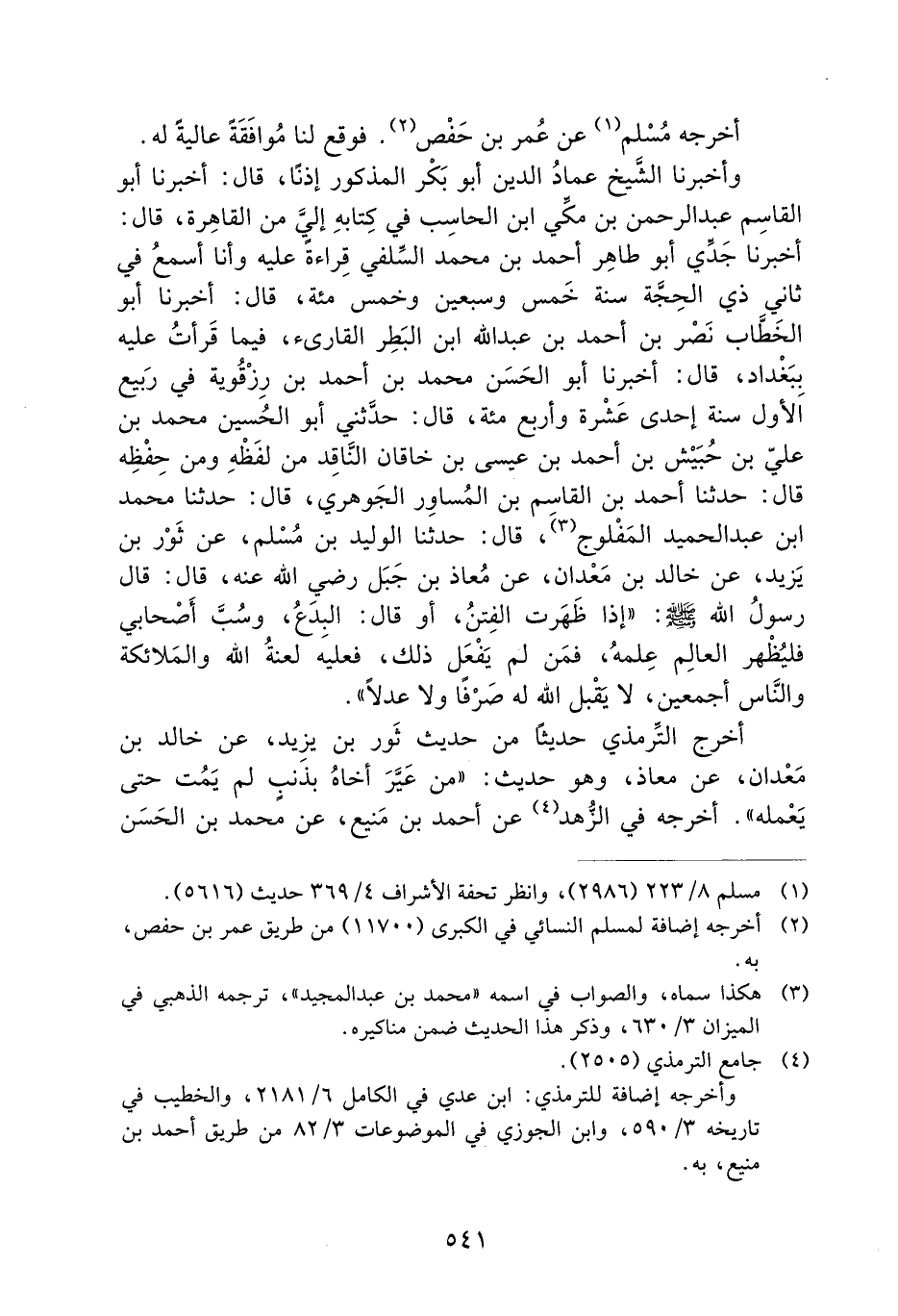 وَأَخْبَرَنَا الشَّيْخُ عِمَادُ الدِّينِ أَبُو بَكْرٍ الْمَذْكُورُ إِذْنًا، قَالَ: أَخْبَرَنَا أَبُو الْقَاسِمِ عَبْدُ الرَّحْمَنِ بْنُ مَكِّيِّ ابْنِ الْحَاسِبِ فِي كِتَابِهِ إِلَيَّ مِنَ الْقَاهِرَةِ، قَالَ: أَخْبَرَنَا جَدِّي أَبُو طَاهِرٍ أَحْمَدُ بْنُ مُحَمَّدٍ السِّلَفِيُّ قِرَاءَةً عَلَيْهِ وَأَنَا أَسْمَعُ فِي ثَانِي ذي الحجة سنة خمس وسبعين وخمس مئة، قَالَ: أَخْبَرَنَا أَبُو الْخَطَّابِ نَصْرُ بْنُ أَحْمَدَ بْنِ عَبْدِ اللَّهِ ابْنِ الْبَطِرِ الْقَارِئُ، فِيمَا قَرَأْتُ عَلَيْهِ بِبَغْدَادَ، قَالَ: أَخْبَرَنَا أَبُو الْحَسَنِ مُحَمَّدُ بْنُ أَحْمَدَ بْنِ رِزْقَوَيْهِ فِي رَبِيعٍ الأول سنة إحدى عشرة وأربع مئة، قَالَ: حَدَّثَنِي أَبُو الْحُسَيْنِ مُحَمَّدُ بْنُ عَلِيِّ بْنِ حُبَيْشِ بْنِ أَحْمَدَ بْنِ عِيسَى بْنِ خَاقَانَ النَّاقِدُ مِنْ لَفْظِهِ وَمِنْ حِفْظِهِ قَالَ: حَدَّثَنَا أَحْمَدُ بْنُ الْقَاسِمِ بْنِ الْمُسَاوِرِ الْجَوْهَرِيُّ، قال: حدثنا محمد ابن عَبْدِ الْحَمِيدِ الْمَفْلُوجُ، قَالَ: حَدَّثَنَا الْوَلِيدُ بْنُ مُسْلِمٍ، عَنْ ثَوْرِ بْنِ يَزِيدَ، عَنْ خَالِدِ بْنِ مَعْدَانَ، عَنْ مُعَاذِ بْنِ جَبَلٍ رَضِيَ اللَّهُ عَنْهُ، قَالَ: قَالَ رَسُولُ اللَّهِ صَلَّى اللَّهُ عَلَيْهِ وَسَلَّمَ: ((إِذَا ظَهَرَتِ الْفِتَنُ، أَوْ قَالَ: الْبِدَعُ، وَسُبَّ أَصْحَابِي فَلْيُظْهِرِ الْعَالِمُ عِلْمَهُ، فمن لم يفعل ذلك، فَعَلَيْهِ لَعْنَةُ اللَّهِ وَالْمَلائِكَةِ وَالنَّاسِ أَجْمَعِينَ، لا يَقْبَلُ اللَّهُ لَهُ صَرْفًا وَلا عَدْلا)) .