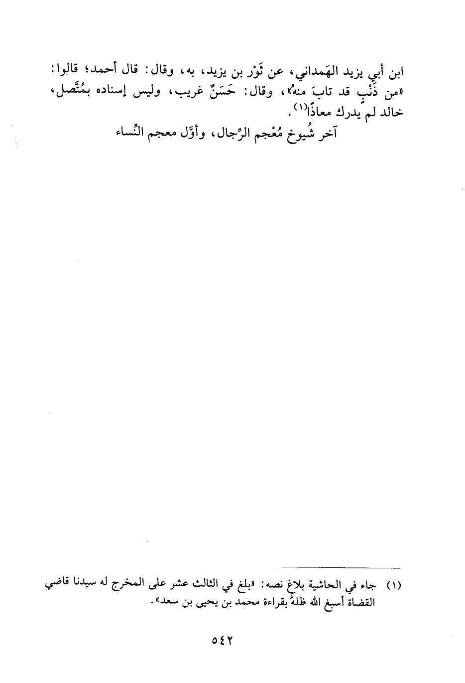 بْنِ أَبِي يَزِيدَ الْهَمْدَانِيِّ، عَنْ ثَوْرِ بْنِ يَزِيدَ، بِهِ، وَقَالَ: قَالَ أَحْمَدُ؛ قَالُوا: ((مِنْ ذَنْبٍ قَدْ تَابَ مِنْهُ)) ، وَقَالَ: حسنٌ غَرِيبٌ، وَلَيْسَ إِسْنَادُهُ بِمُتَّصِلٍ، خَالِدٌ لَمْ يُدْرِكْ مُعَاذًا.