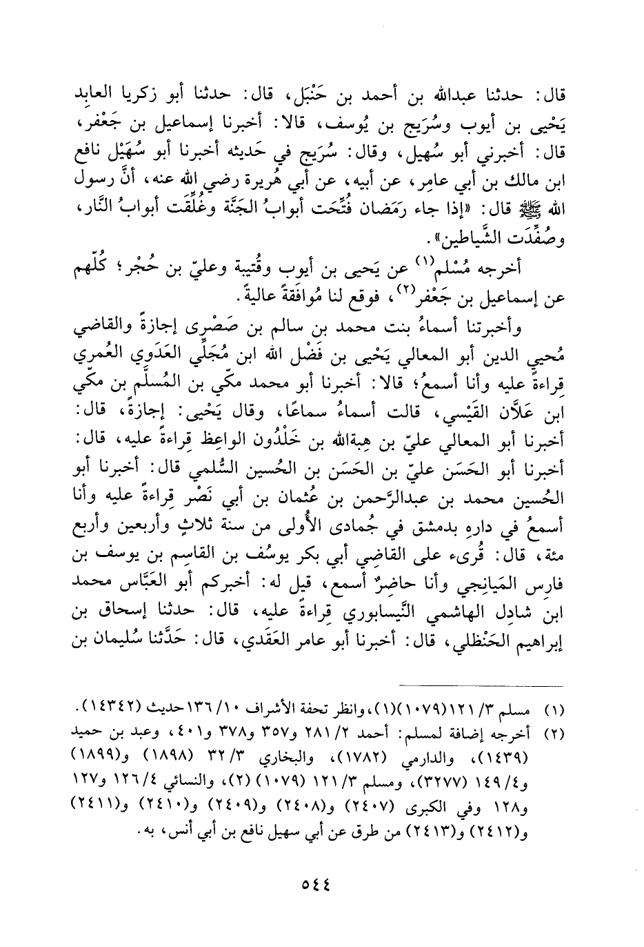 قَالَ: حَدَّثَنَا عَبْدُ اللَّهِ بْنُ أَحْمَدَ بْنِ حَنْبَلٍ، قَالَ: حَدَّثَنَا أَبُو زَكَرِيَّا الْعَابِدُ يَحْيَى بْنُ أَيُّوبَ وَسُرَيْجُ بْنُ يُوسُفَ، قَالا: أَخْبَرَنَا إِسْمَاعِيلُ بْنُ جَعْفَرٍ، قَالَ: أَخْبَرَنِي أَبُو سُهَيْلٍ، وَقَالَ: سُرَيْجٌ فِي حَدِيثِهِ أَخْبَرَنَا أَبُو سُهَيْلٍ نَافِعُ بْنُ مَالِكِ بْنِ أَبِي عَامِرٍ، عَنْ أَبِيهِ، عَنْ أَبِي هُرَيْرَةَ رَضِيَ اللَّهُ عَنْهُ، أَنَّ رَسُولَ اللَّهِ صَلَّى اللَّهُ عَلَيْهِ وَسَلَّمَ قَالَ: ((إِذَا جَاءَ رَمَضَانُ فُتِحَتْ أَبْوَابُ الْجَنَّةِ وَغُلِّقَتْ أَبْوَابُ النَّارِ، وَصُفِّدَتِ الشَّيَاطِينُ)) .