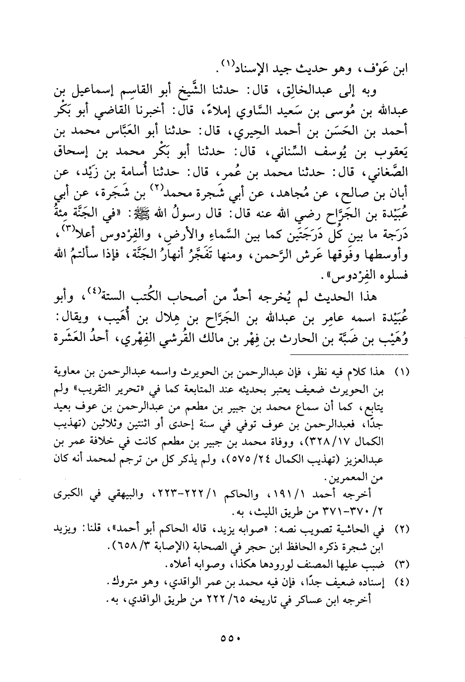 وَبِهِ إِلَى عَبْدِ الْخَالِقِ، قَالَ: حَدَّثَنَا الشَّيْخُ أَبُو الْقَاسِمِ إِسْمَاعِيلُ بْنُ عَبْدِ اللَّهِ بْنِ مُوسَى بْنِ سَعِيدٍ السَّاوِيُّ إِمْلاءً، قَالَ: أَخْبَرَنَا الْقَاضِي أَبُو بَكْرٍ أَحْمَدُ بْنُ الْحَسَنِ بْنِ أَحْمَدَ الْحِيرِيُّ، قَالَ: حَدَّثَنَا أَبُو الْعَبَّاسِ مُحَمَّدُ بْنُ يَعْقُوبَ بْنِ يُوسُفَ السِّنَانِيُّ، قَالَ: حَدَّثَنَا أَبُو بَكْرٍ مُحَمَّدُ بْنُ إِسْحَاقَ الصَّغَانِيُّ، قَالَ: حَدَّثَنَا مُحَمَّدُ بْنُ عُمَرَ، قَالَ: حَدَّثَنَا أُسَامَةُ بْنُ زَيْدٍ، عَنْ أَبَانِ بْنِ صَالِحٍ، عَنْ مُجَاهِدٍ، عَنْ أَبِي شَجَرَةَ مُحَمَّدِ بْنِ شَجَرَةَ، عَنْ أَبِي عُبَيْدَةَ بْنِ الْجَرَّاحِ رَضِيَ اللَّهُ عَنْهُ قَالَ: قَالَ رَسُولُ اللَّهِ صَلَّى اللَّهُ عَلَيْهِ وَسَلَّمَ: ((في الجنة مئة دَرَجَةٍ مَا بَيْنَ كُلِّ دَرَجَتَيْنِ كَمَا بَيْنَ السَّمَاءِ وَالأَرْضِ، وَالْفِرْدَوْسُ أَعْلا، وَأَوْسَطُهَا وَفَوْقَهَا عَرْشُ الرَّحْمَنِ، وَمِنْهَا تُفَجَّرُ أَنْهَارُ الْجَنَّةِ، فَإِذَا سَأَلْتُمُ اللَّهَ فَسَلُوهُ الْفِرْدَوْسَ)) .