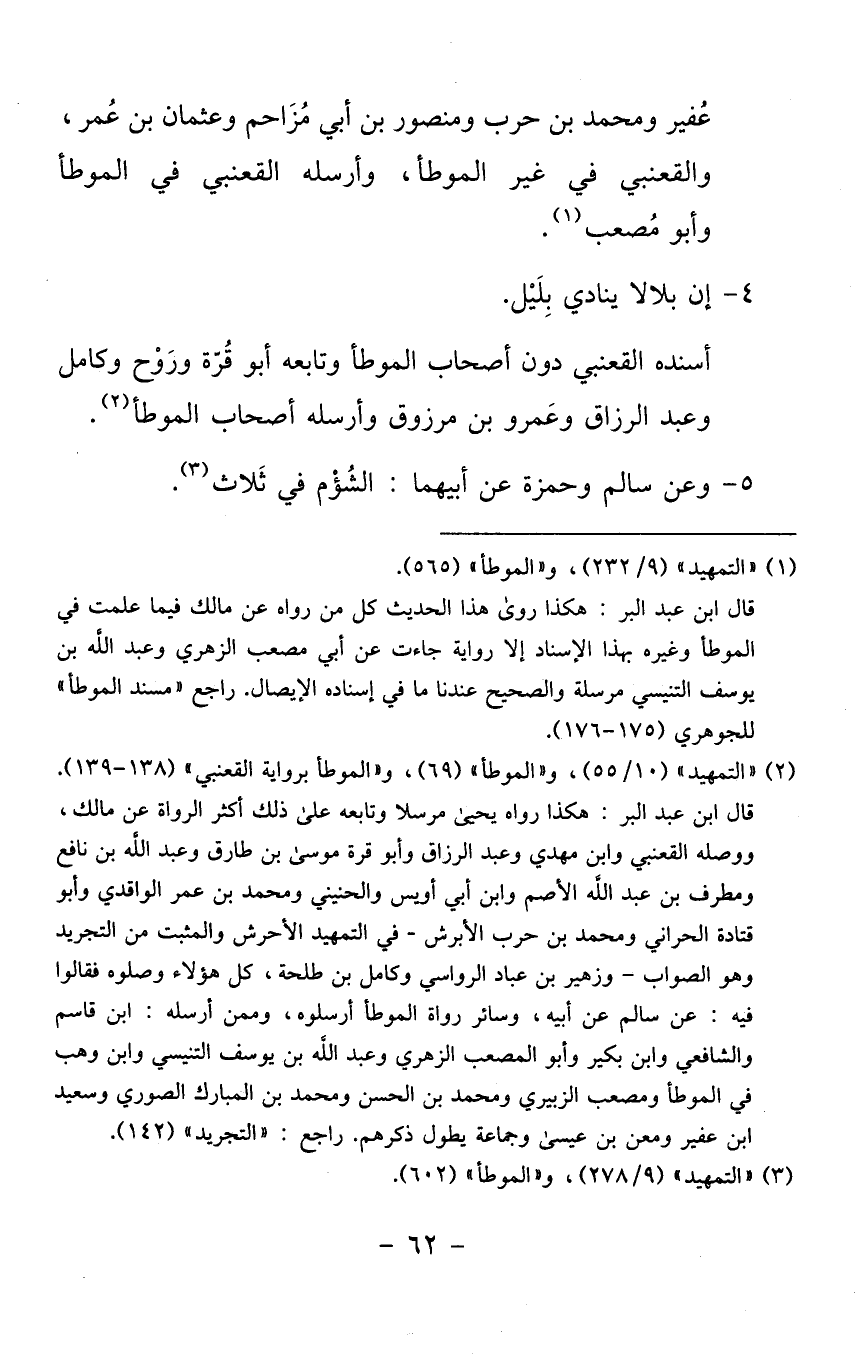 أسْندهُ القعْنبِي دون أَصْحَاب الْمُوَطَّأ وَتَابعه أَبُو قُرَّة وروح وكامل وَعبد الرَّزَّاق وَعَمْرو بن مَرْزُوق وأرسله أَصْحَاب الْمُوَطَّأ.