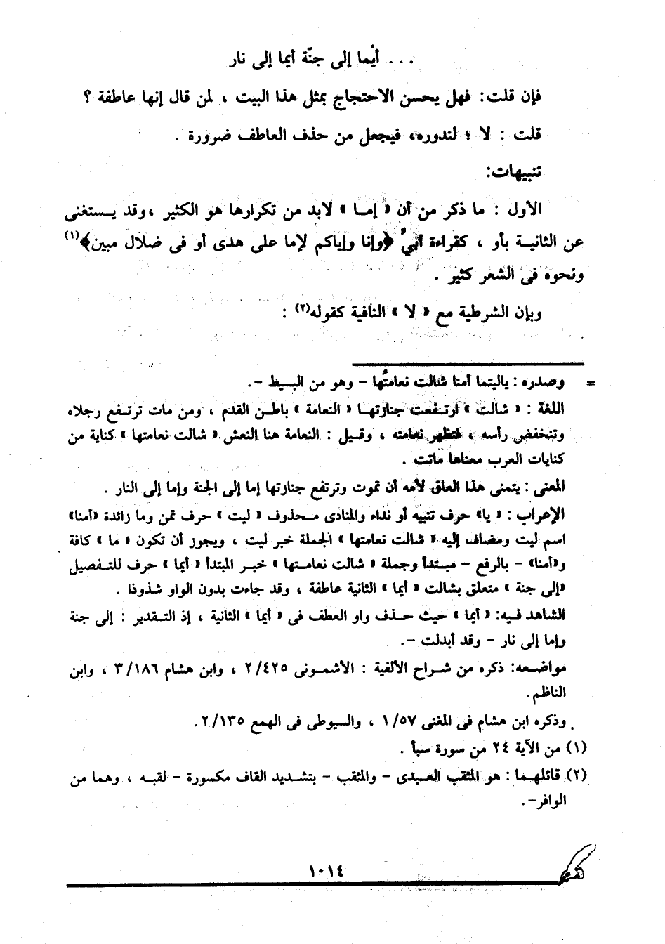 الشاهد فيه: "أيما" حيث حذف واو العطف في "أيما" الثانية، إذ التقدير: إلى جنة وإما إلى نار وقد أبدلت.