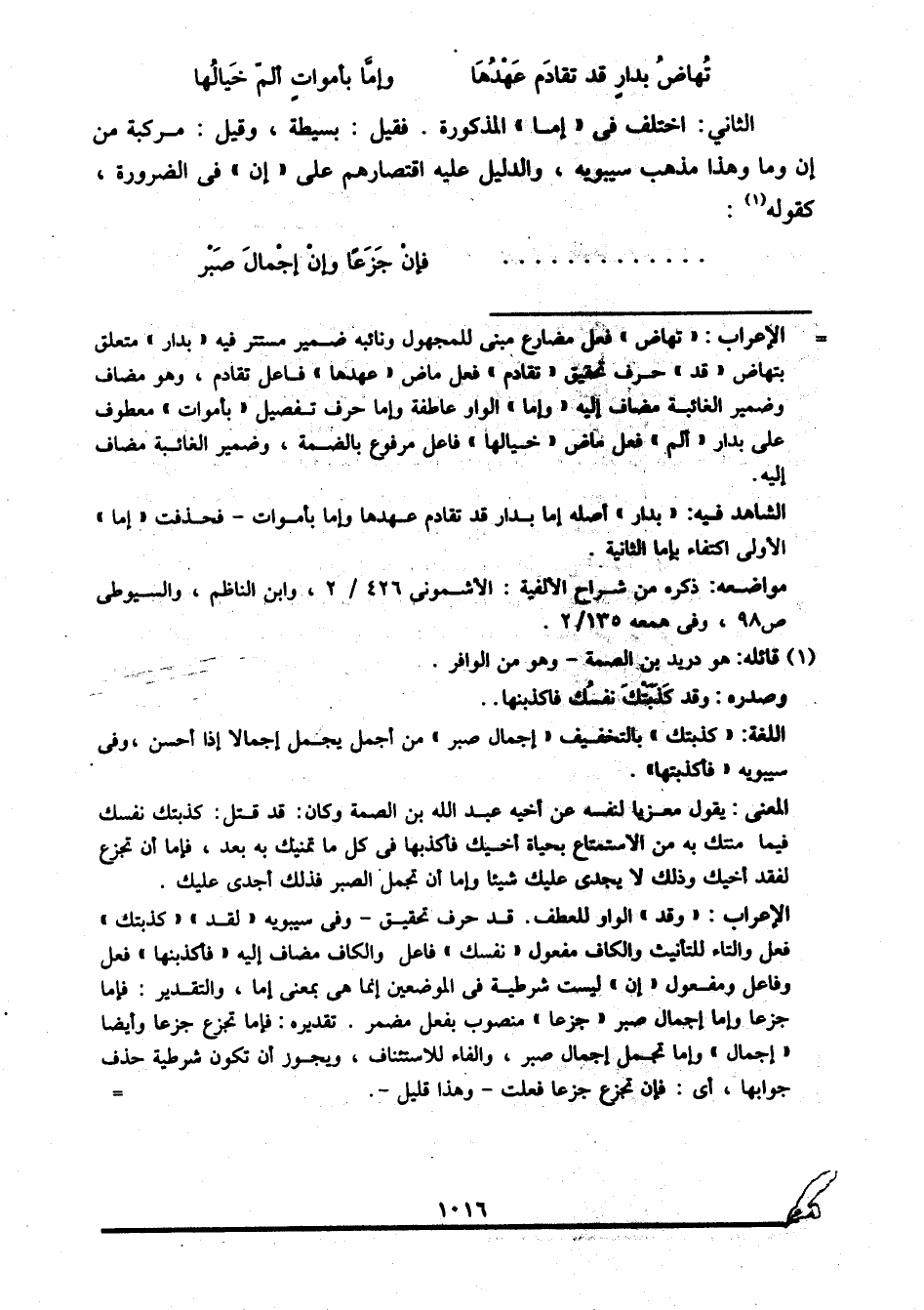 = الإعراب: "تهاض" فعل مضارع مبني للمجهول ونائبه ضمير مستتر فيه, "بدار" متعلق بتهاض, "قد" حرف تحقيق, "تقادم" فعل ماض, "عهدها" فاعل تقادم، وهو مضاف وضمير الغائبة مضاف إليه, "وإما" الواو عاطفة وإما حرف تفصيل, "بأموات" معطوف على بدار, "ألم" فعل ماض, "خيالها" فاعل مرفوع بالضمة، وضمير الغائبة مضاف إليه.