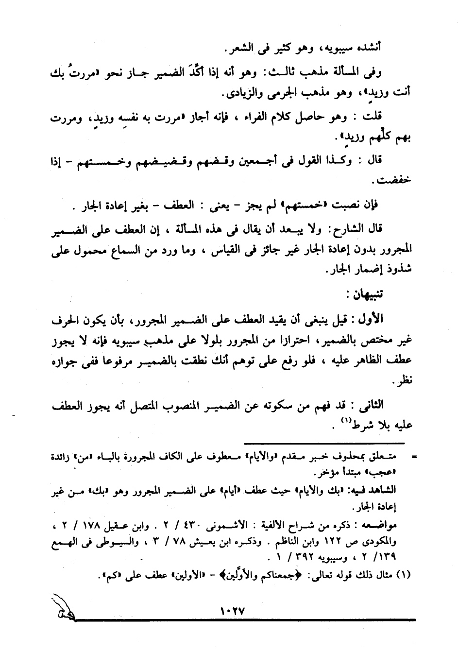 قال الشارح: ولا يبعد أن يقال في هذه المسألة: إن العطف على الضمير المجرور بدون إعادة الجار غير جائز في القياس، وما ورد من السماع محمول على شذوذ إضمار الجار.