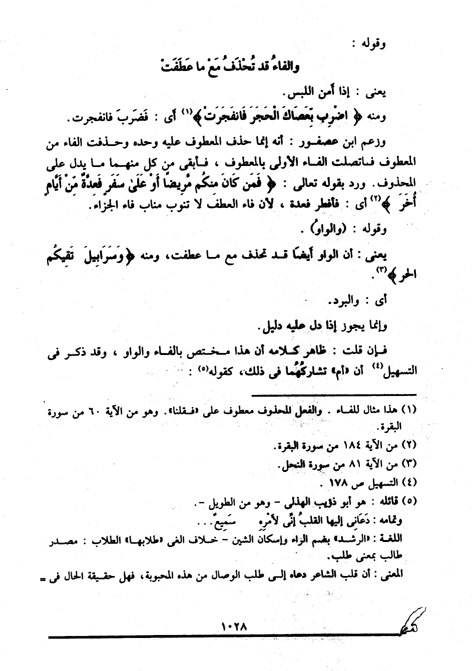وزعم ابن عصفور أنه إنما حذف المعطوف عليه وحده وحذفت الفاء من المعطوف, فاتصلت الفاء الأولى بالمعطوف، فأبقي من كل منهما ما يدل على المحذوف. ورُدّ بقوله تعالى: {فَمَنْ كَانَ مِنْكُمْ مَرِيضًا أَوْ عَلَى سَفَرٍ فَعِدَّةٌ مِنْ أَيَّامٍ أُخَرَ} 2 أي: فأفطر فعدة؛ لأن فاء العطف لا تنوب مناب فاء الجزاء.