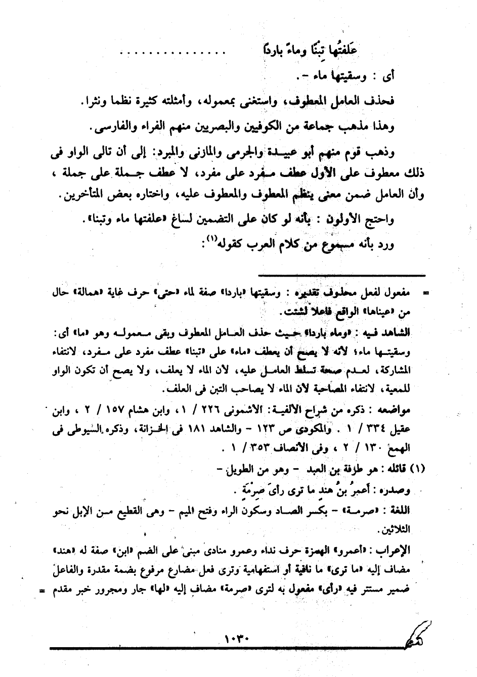 الشاهد فيه: "وماء باردا" حيث حذف العامل المعطوف وبقي معموله وهو "ما" أي: وسقيتُها ماء؛ لأنه لا يصح أن يعطف "ماء" على "تبنا" عطف مفرد على مفرد لانتفاء المشاركة؛ لعدم صحة تسلط العامل عليه؛ لأن الماء لا يعلف، ولا يصح أن تكون الواو للمعية؛ لانتفاء المصاحبة لأن الماء لا يصاحب التبن في العلف.