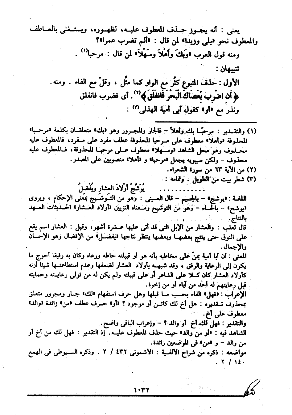 1 والتقدير: مرحبا بك وأهلا, فالجار والمجرور وهو "بك" متعلقان بكلمة "مرحبا" المحذوفة, "وأهلا" معطوف على مرحبا المحذوفة عطف مفرد على مفرد، فالمعطوف عليه محذوف وهو محل الشاهد, "وسهلا" معطوف على مرحبا المحذوفة، فالمعطوف عليه محذوف, ولكن سيبويه يجعل "مرحبا" و"أهلا" منصوبين على المصدر.