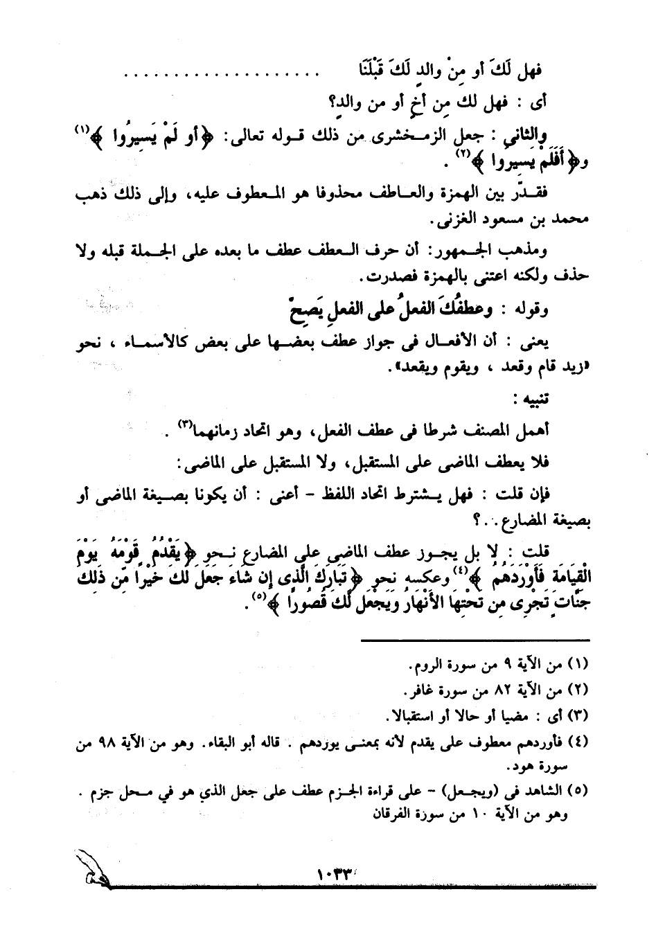 قلت: لا, بل يجوز عطف الماضي على المضارع نحو: {يَقْدُمُ قَوْمَهُ يَوْمَ الْقِيَامَةِ فَأَوْرَدَهُمُ} 4 وعكسه نحو: {تَبَارَكَ الَّذِي إِنْ شَاءَ جَعَلَ لَكَ خَيْرًا مِنْ ذَلِكَ جَنَّاتٍ تَجْرِي مِنْ تَحْتِهَا الْأَنْهَارُ وَيَجْعَلْ لَكَ قُصُورًا} 5.