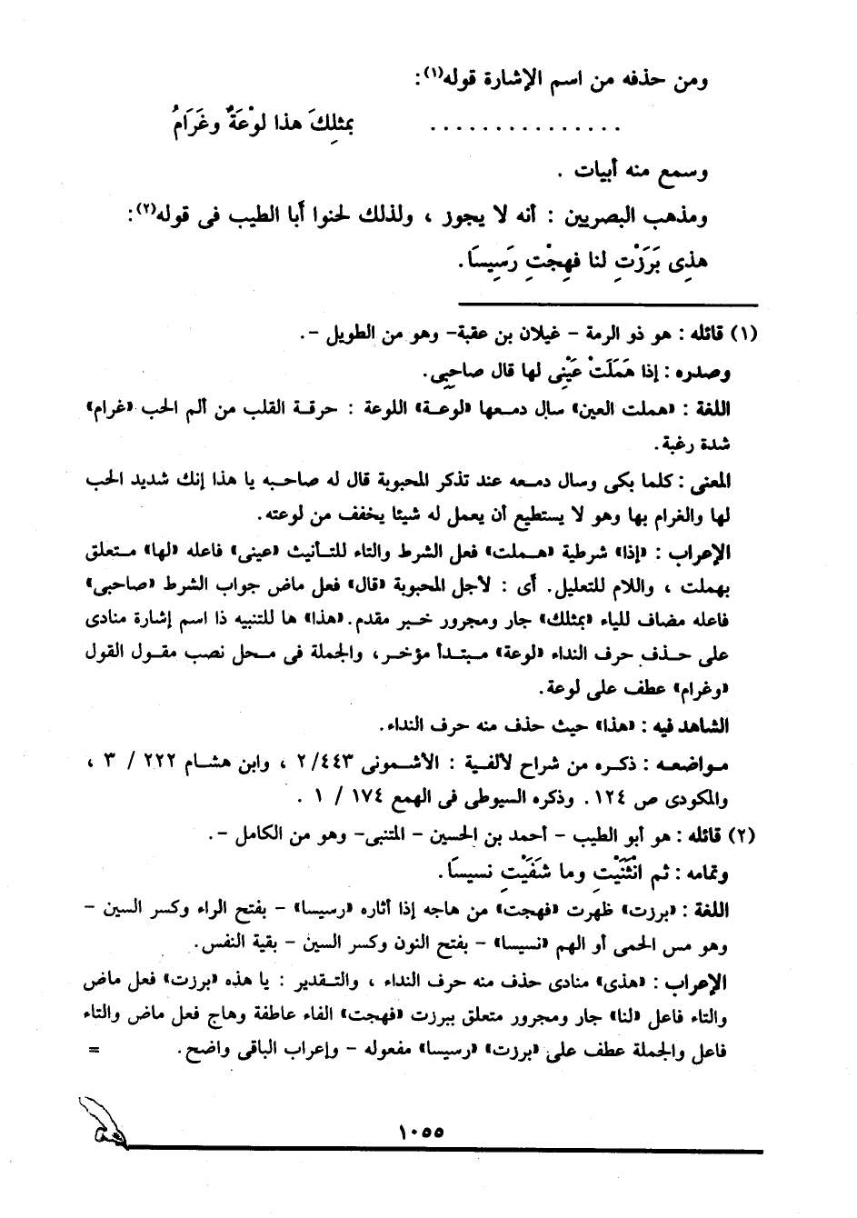 الإعراب: "هذي" منادى حذف منه حرف النداء، والتقدير: يا هذه, "برزت" فعل ماض والتاء فاعل, "لنا" جار ومجرور متعلق ببرزت, "فهجت" الفاء عاطفة وهاج فعل ماض والتاء فاعل والجملة عطف على "برزت", "رسيسا" مفعوله, وإعراب الباقي واضح.