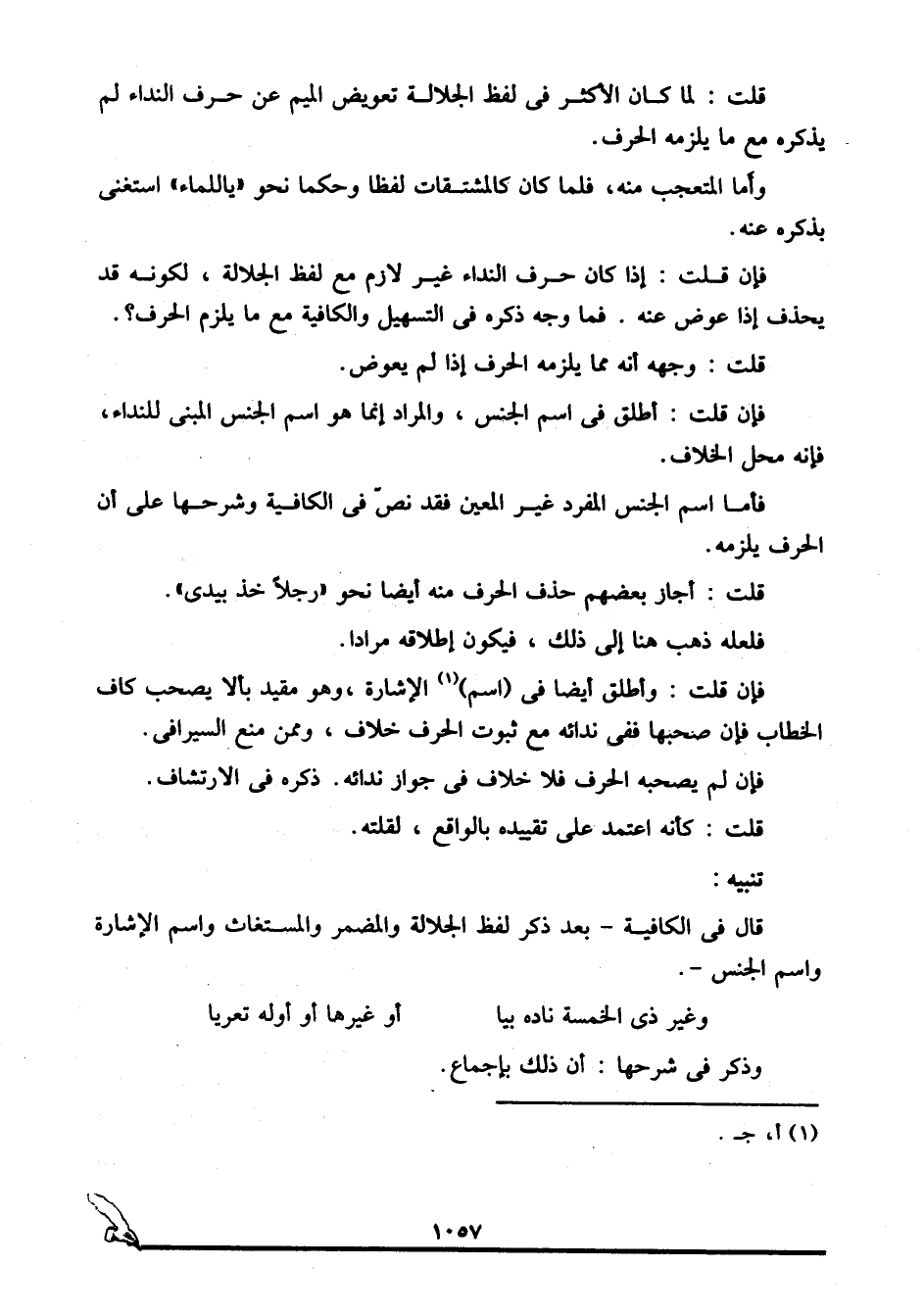 فإن قلت: إذا كان حرف النداء غير لازم مع لفظ الجلالة؛ لكونه قد يحذف إذا عوض عنه. فما وجه ذكره في التسهيل والكافية مع ما يلزم الحرف؟