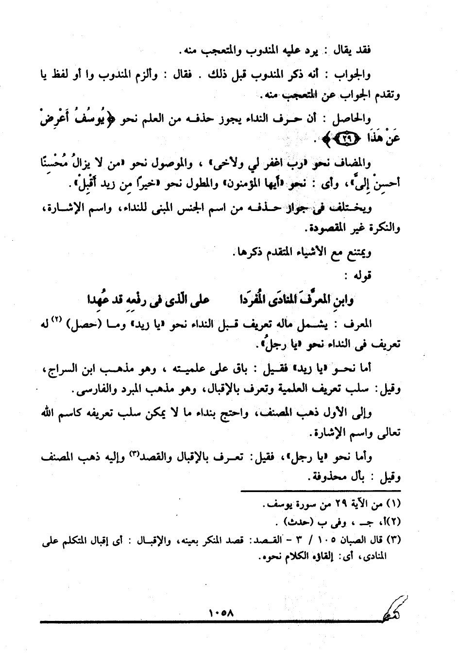 3 قال الصبان 105/ 3: القصد: قصد المنكر بعينه، والإقبال أي: إقبال المتكلم على المنادى، أي: إلقاؤه الكلام نحوه.