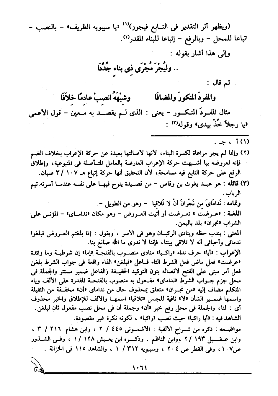 الشاهد فيه: أيا راكبا" حيث نصب "راكبا"؛ لكونه نكرة غير مقصودة.