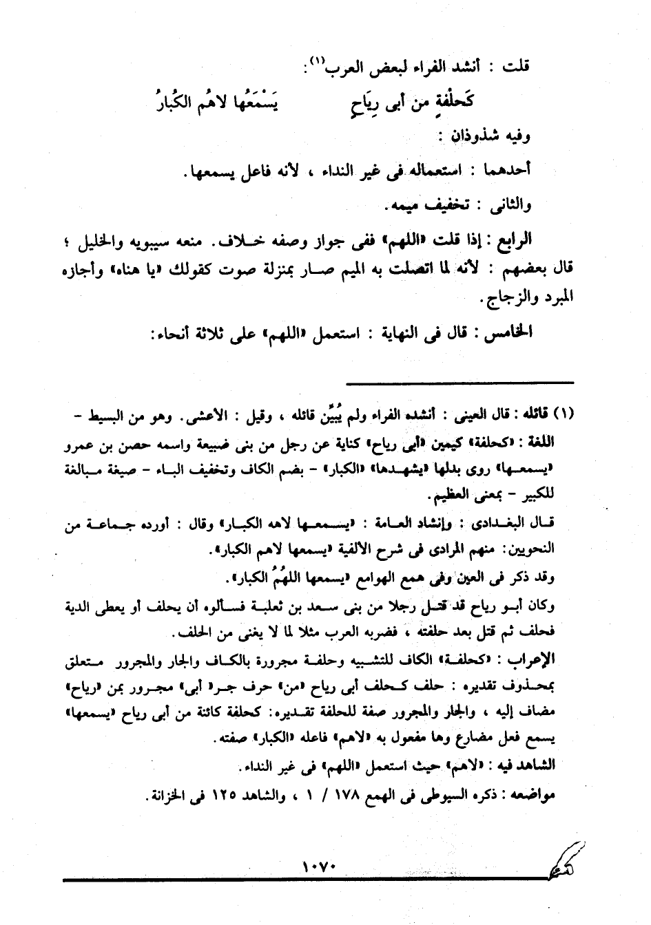 قال البغدادي: وإنشاد العامة: "يسمعها لاهه الكبار" وقال: أورده جماعة من النحويين منهم المرادي في شرح الألفية: "يسمعها لاهم الكبار".
