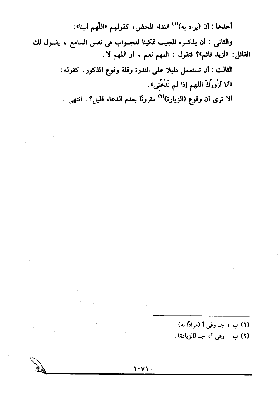 والثاني: أن يذكره المجيب تمكينا للجواب في نفس السامع، يقول لك القائل: "أزيد قائم؟ " فتقول: اللهم نعم، أو اللهم لا.