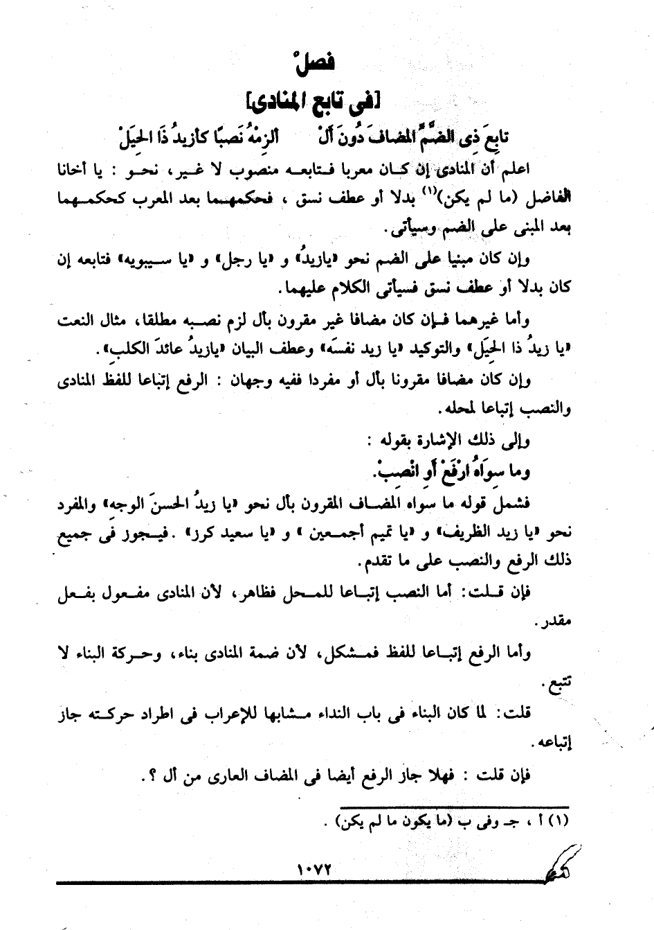 اعلم أن المنادى إن كان معربا فتابعه منصوب لا غير، نحو: يا أخانا الفاضلَ "ما لم يكن"1 بدلا أو عطف نسق، فحكمهما بعد المعرب كحكمهما بعد المبني على الضم وسيأتي.