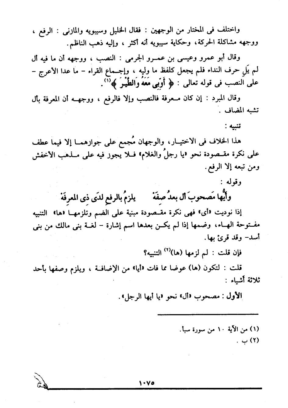 وقال أبو عمرو وعيسى بن عمرو الجرمي: النصب، ووجهه أن ما فيه أل لم يَلِ حرف النداء, فلم يجعل كلفظ ما وليه، وإجماع القراء -ما عدا الأعرج- على النصب في قوله تعالى: {أَوِّبِي مَعَهُ وَالطَّيْرَ} 1.