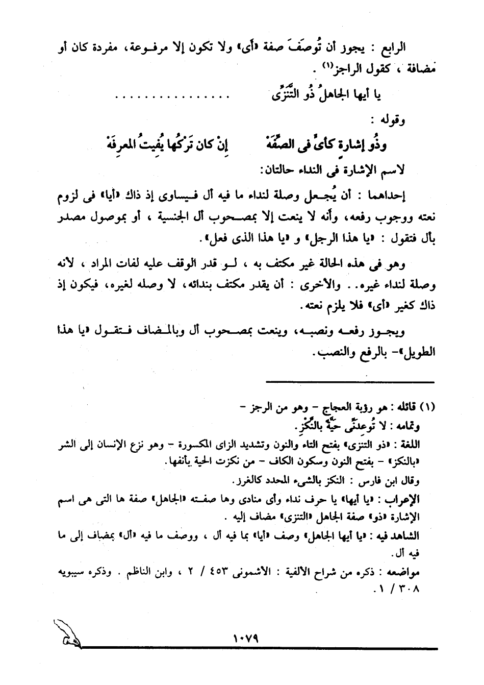 الشاهد فيه: "يا أيها الجاهل", وصف "أيا" بما فيه أل، ووصف ما فيه "أل" بمضاف إلى ما فيه أل.